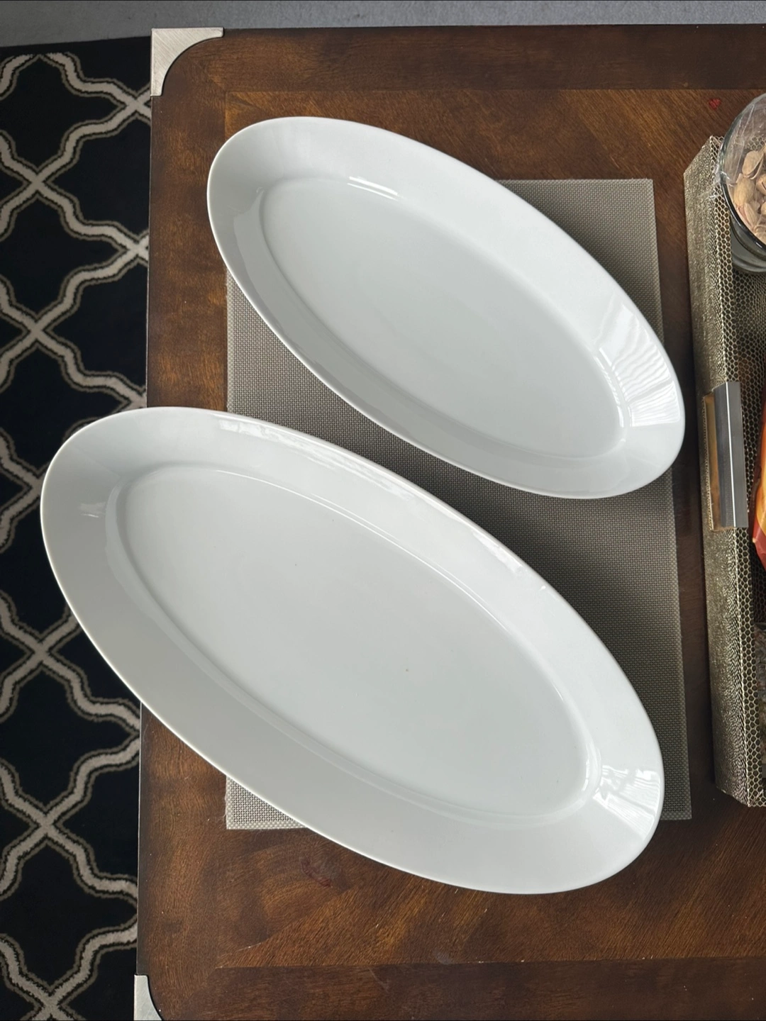 Selling a set of two simple white serving platters! They're perfect for serving appetizers, desserts, or anything else you might need at your next get-together. They are in great condition and ready for a new home