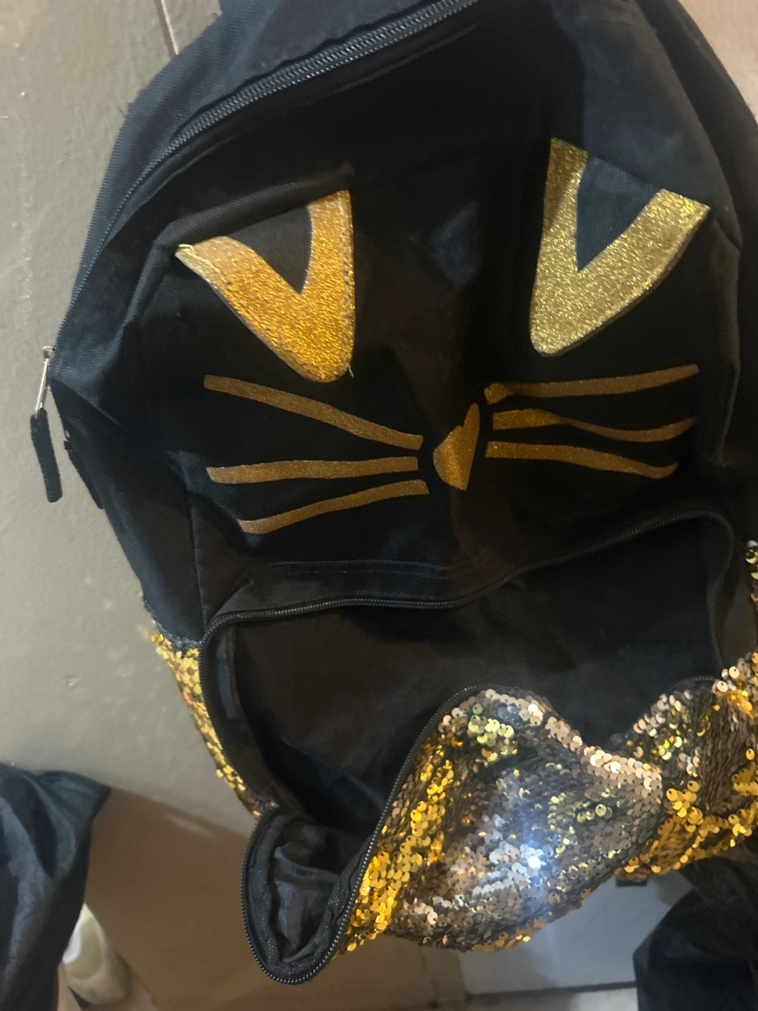 cute black backpack with a gold cat face design! It has glittery gold sequin accents and a zipper closure. Perfect for carrying books or other essentials. Front zipper is broken if you’re able to fix it then it should be good