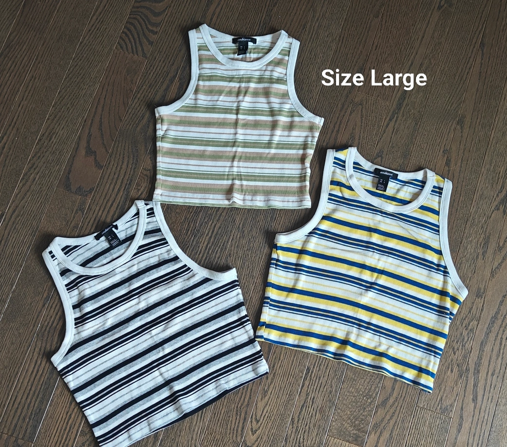 Selling a set of three Forever 21 tank tops in size large! They feature fun stripes in different colours. Great for summer! $5 each or 3 for $10