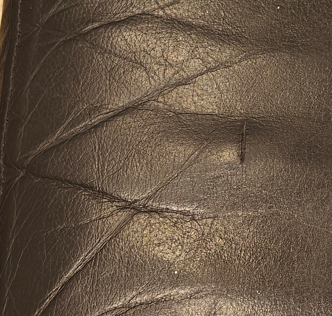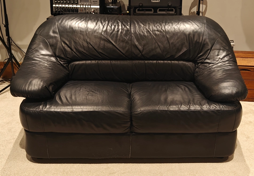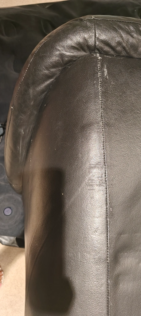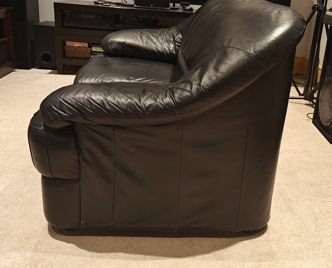 Selling a comfy black leather sofa. It's in gently used condition and would be great for a living room or den. The sofa has a classic design and is made of durable leather material. There are some signs of wear, which are visible in the close-up photo.