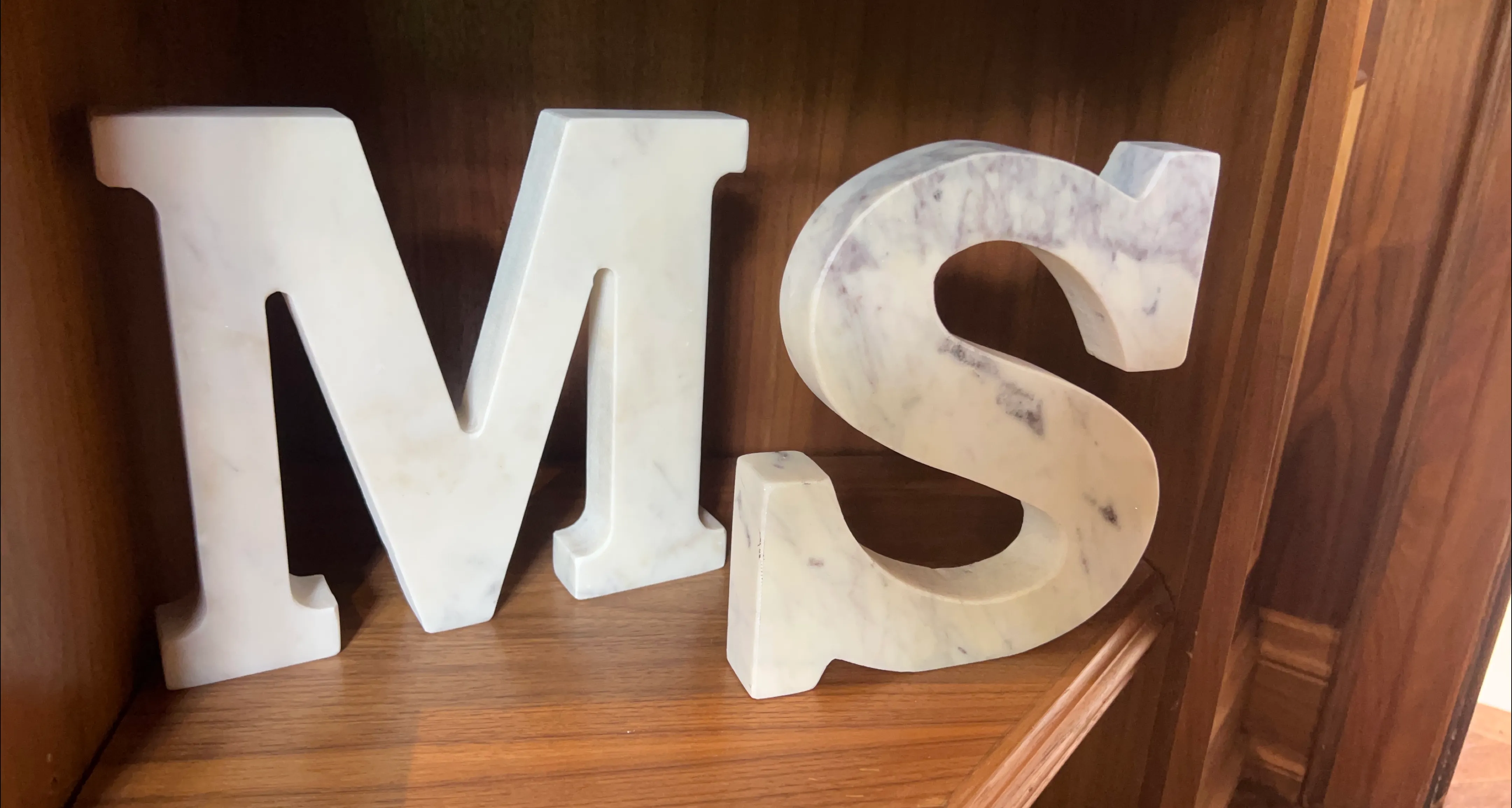 I'm selling a set of decorative marble letters, M and S. They are in great condition and would look lovely on a bookshelf or mantel. They have a nice weight to them and a beautiful marble pattern