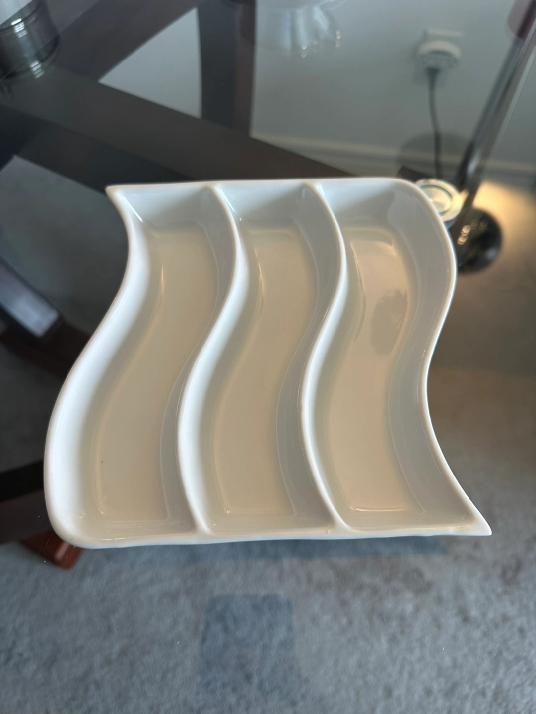 A lovely white ceramic serving dish, perfect for appetizers or snacks! It's in good condition and ready for a new home