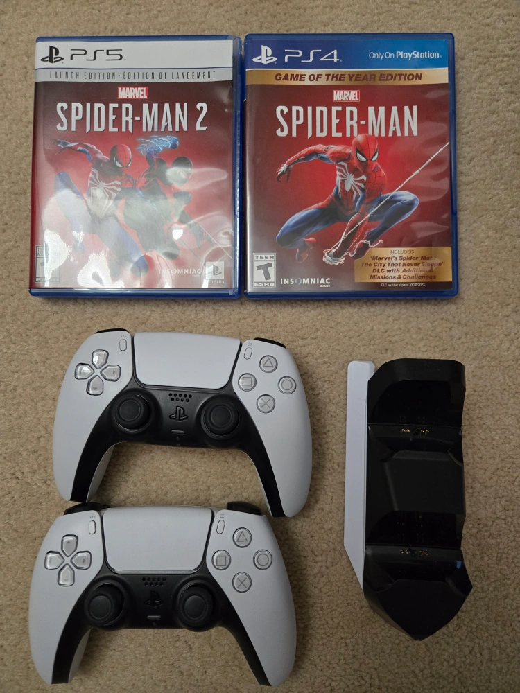 PS5 disc version! I bought it but haven't had time to play it, so I'm selling it. It looks brand new because I barely used it. Includes two controllers, a cover, charging dock and a Spider-Man CD.