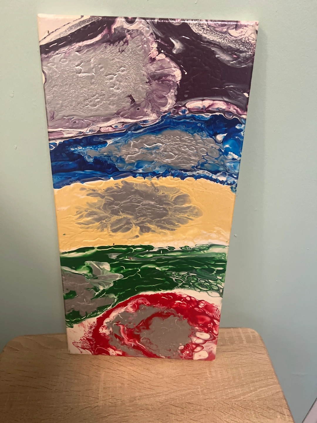 1000+This is a beautiful abstract acrylic pour painting. It features a vibrant mix of colours including red, green, yellow, blue, and purple. It would be a great addition to any home!