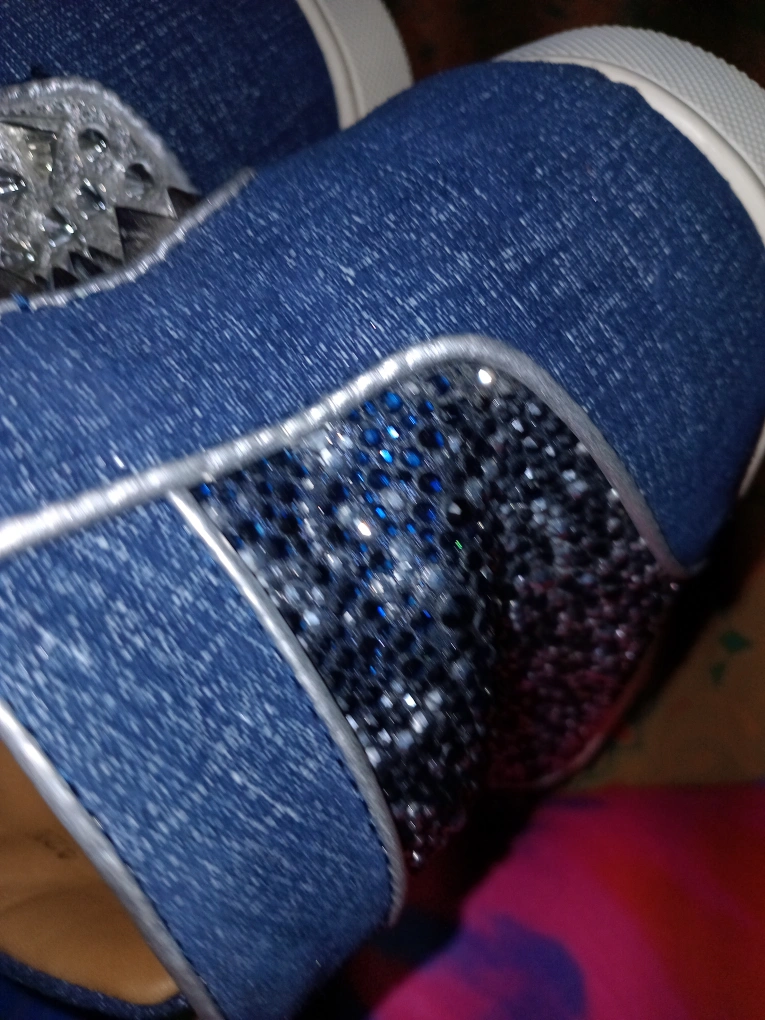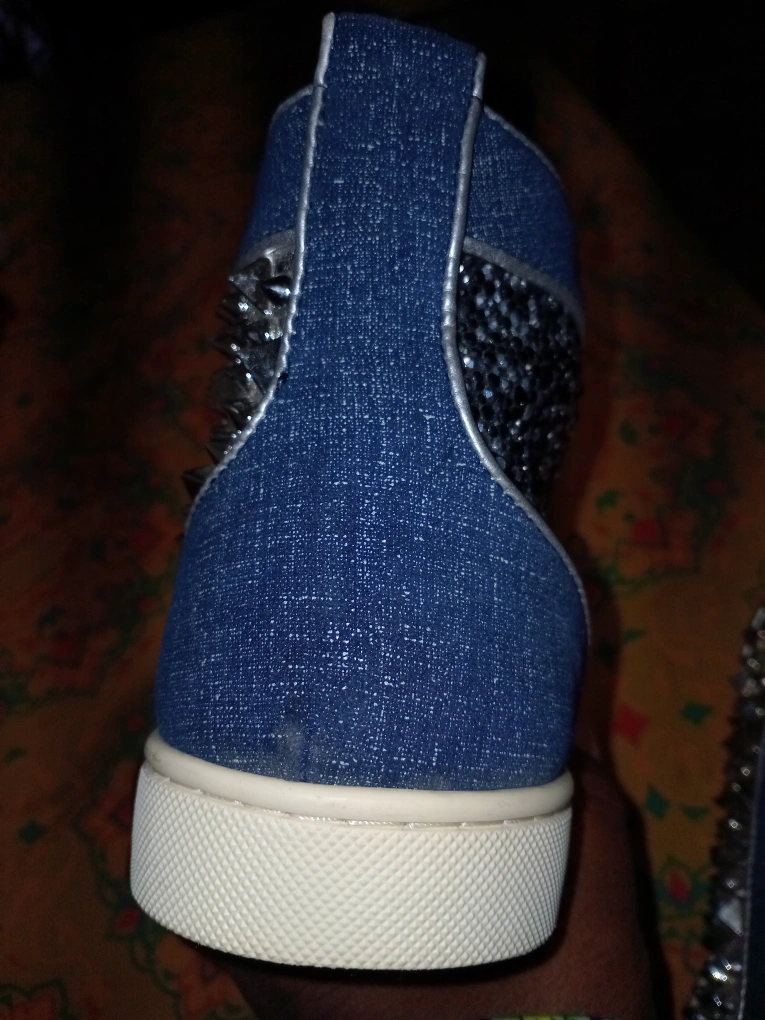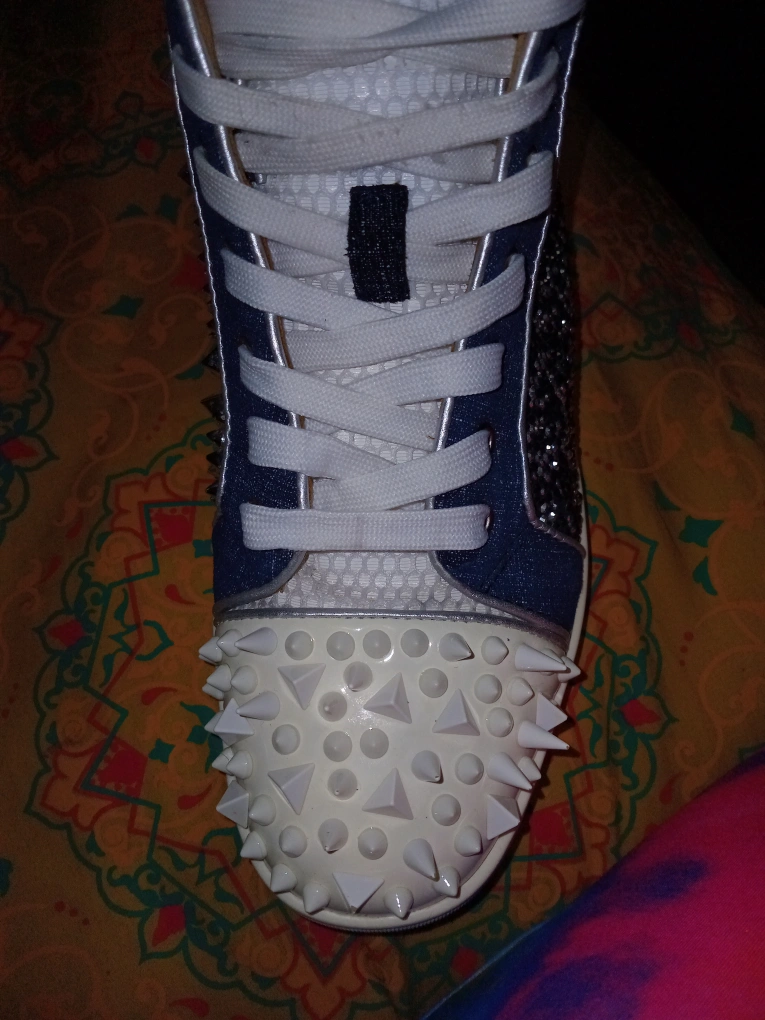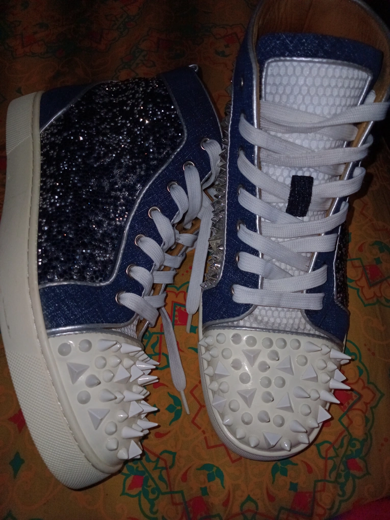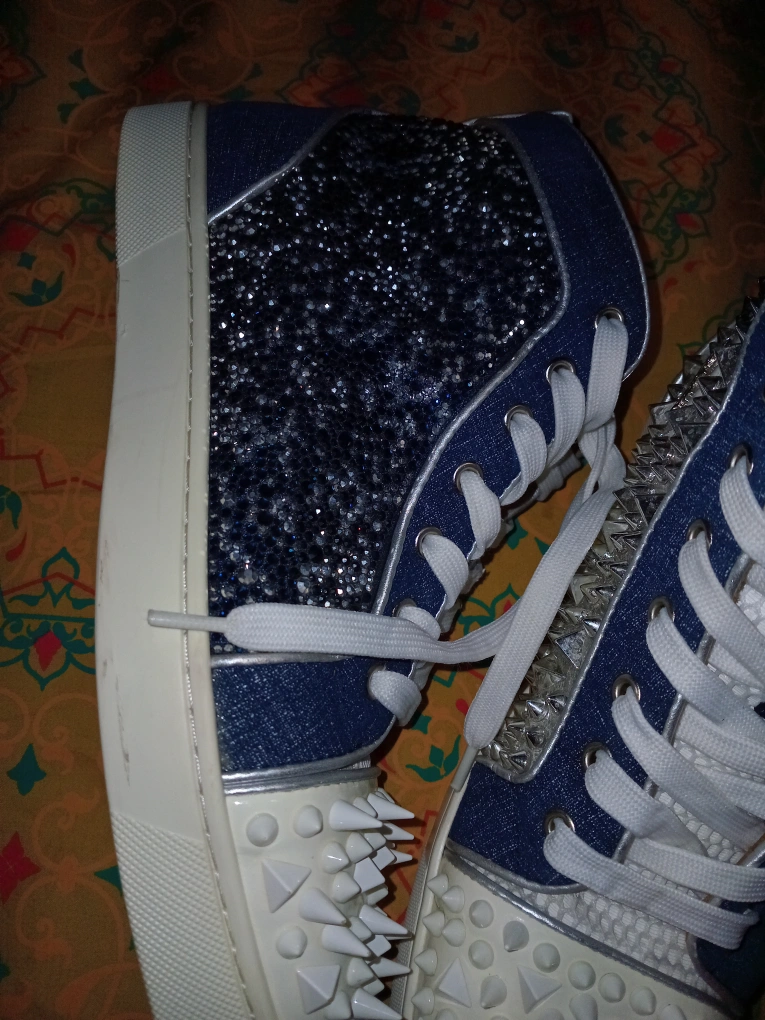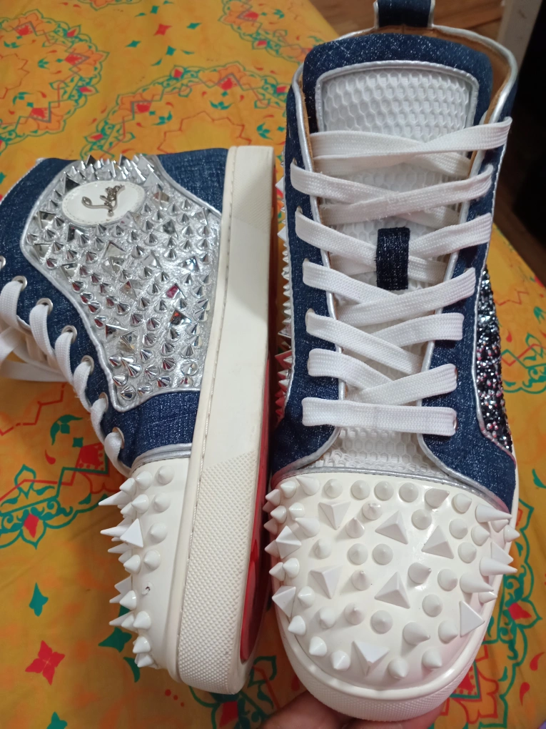 Up for grabs are these Christian Louboutin high-top sneakers! They feature a unique denim design with eye-catching spikes. These shoes are sure to make a statement and add some edge to your wardrobe