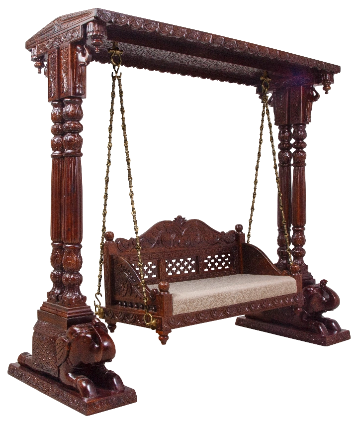 Wanted a beautiful wooden indoor swing! It features detailed carvings and a comfortable seat. The swing is supported by sturdy pillars