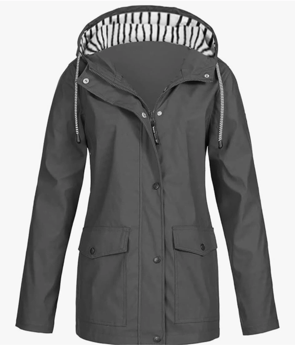A stylish and functional rain jacket perfect for those wet Canadian days! It's a size 5x which equivalents to an extra large and comes in a versatile grey colour. The jacket features a hood, front pockets, and a button-up dome closure with two front pockets. to keep you dry and comfortable during unexpected showers