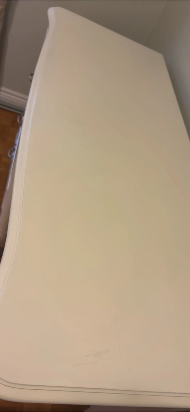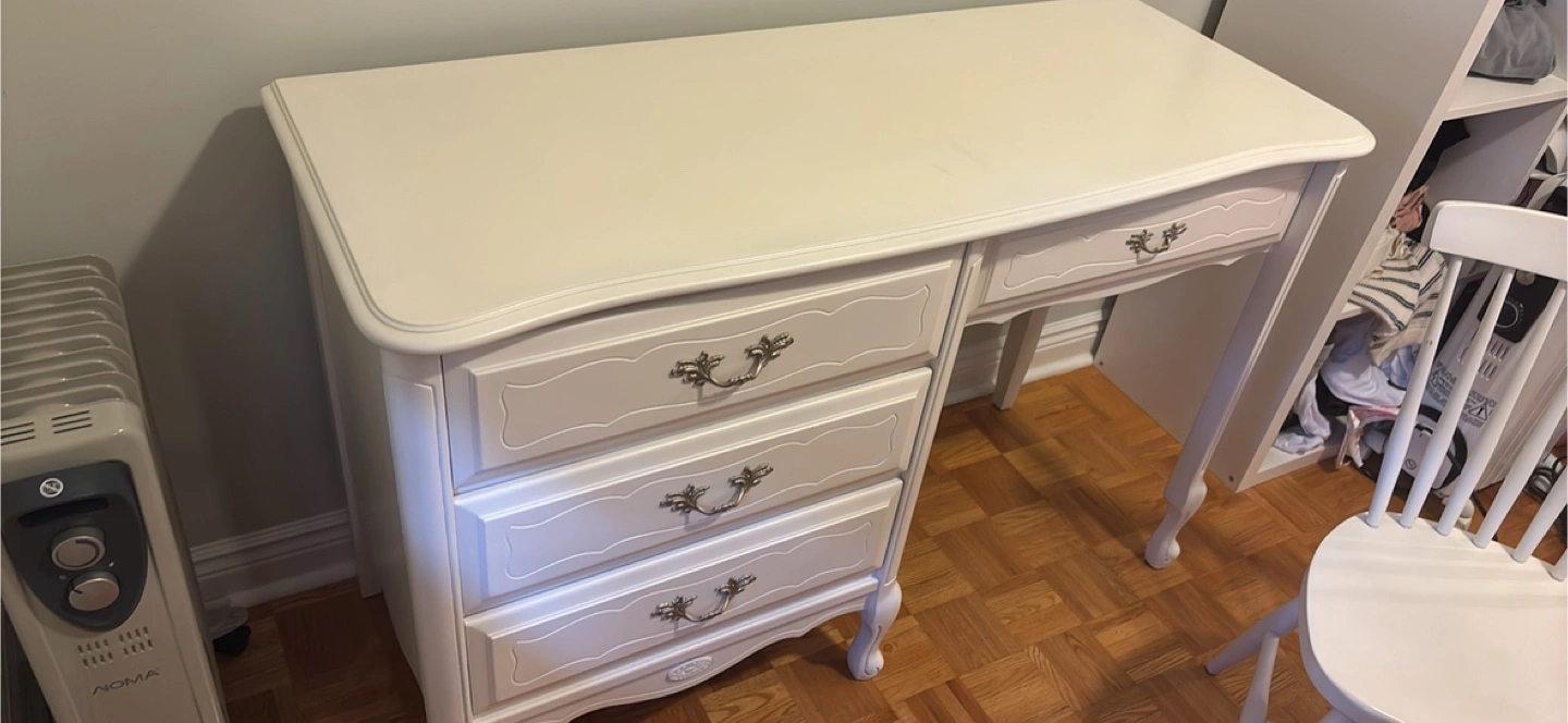 Selling a charming vintage vanity desk with a matching chair. It's perfect for adding a touch of elegance to any room. The set is in good condition and ready for a new home. The vanity features lovely drawer pulls and a classic design. The chair complements the desk beautifully, making it a complete set for your space