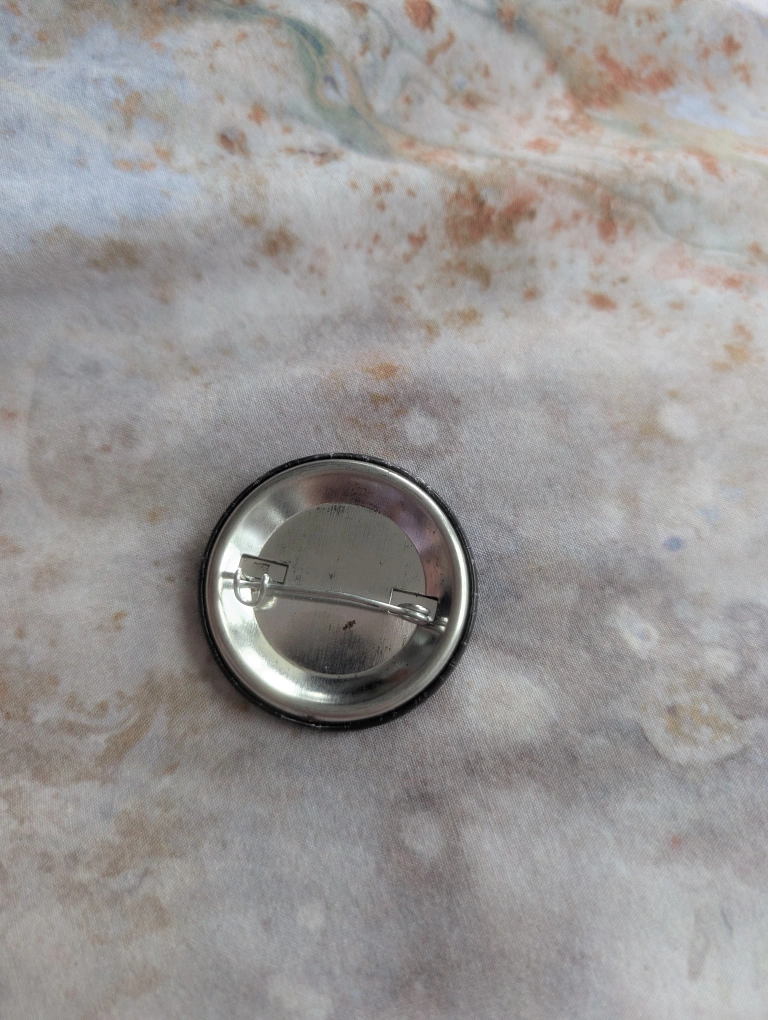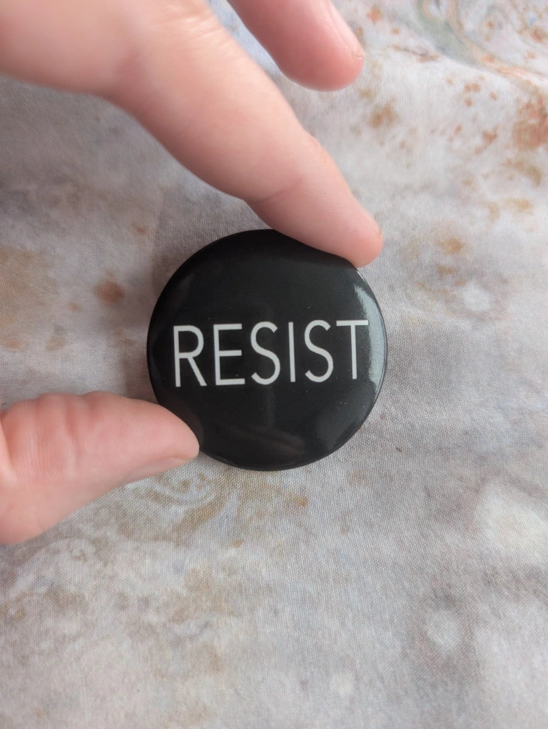 Selling a button that says 'RESIST' in white text on a black background. It's in great condition and ready to be pinned onto a jacket, bag, or anything else you like!
