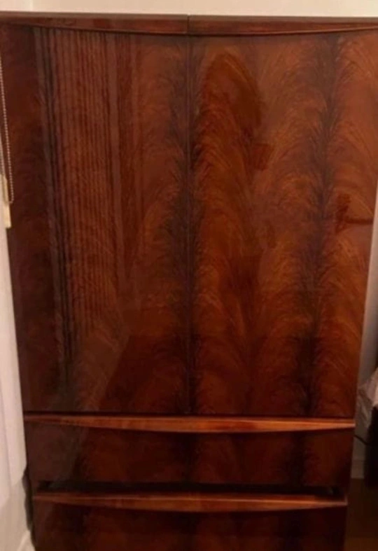 Here's a beautiful armoire wardrobe with a walnut finish. It has a classic look and plenty of storage space with shelves and drawers. Made in Italy