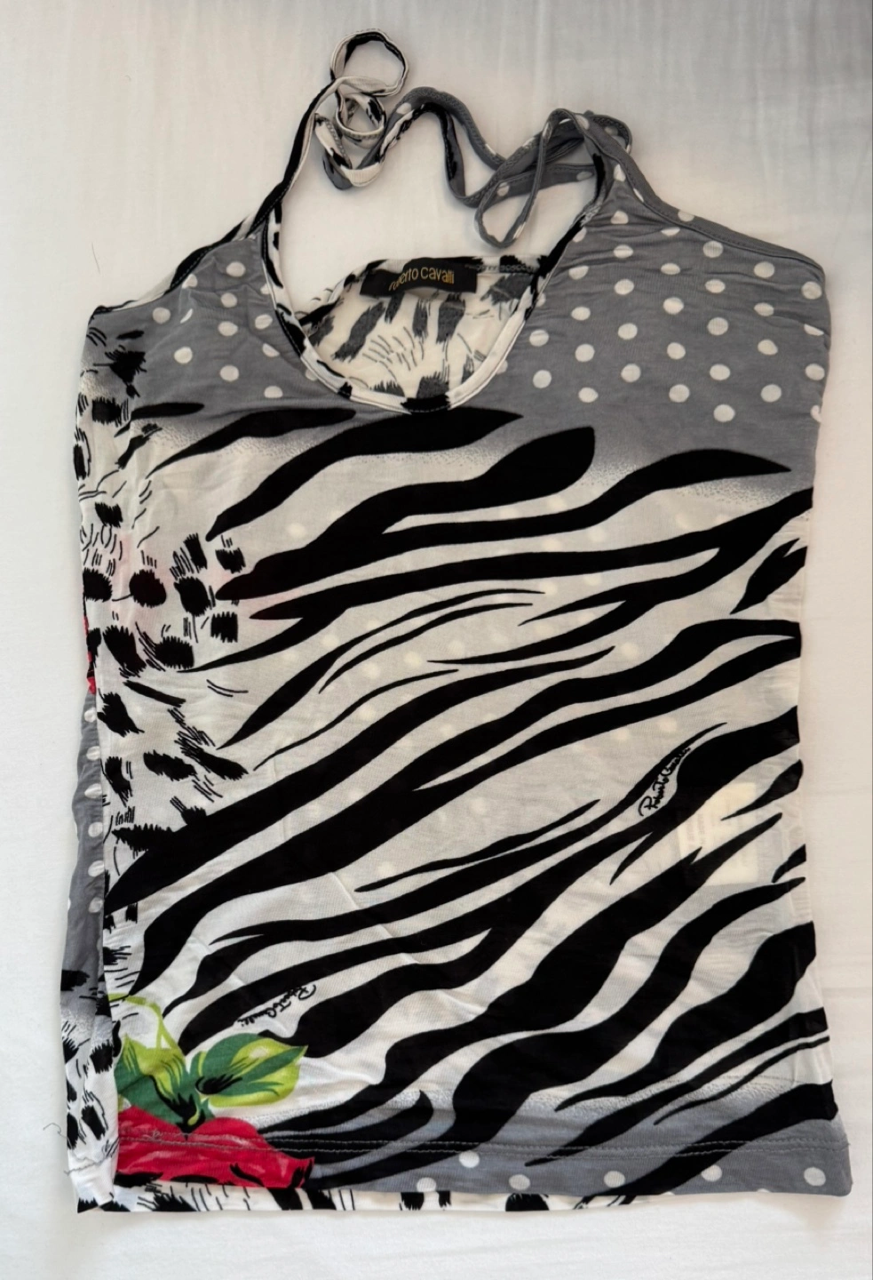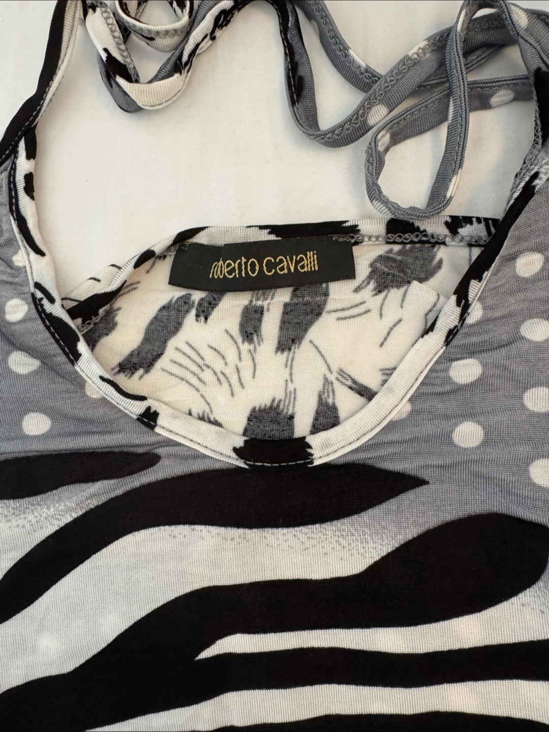 This Roberto Cavalli top features a unique animal print design in black, white, and grey. It's a stylish piece that adds a touch of wildness to any outfit. The material feels soft and comfortable, perfect for everyday wear. It is in great condition!