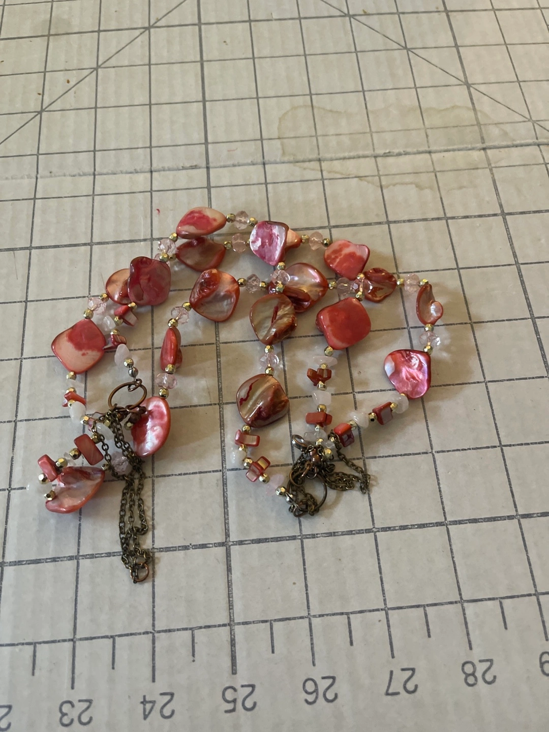57A lovely red shell bead necklace! It features a mix of shell pieces, clear beads, and gold-toned accents. The chain is a bronze colour, adding a vintage touch. This necklace would be a great addition to any outfit!