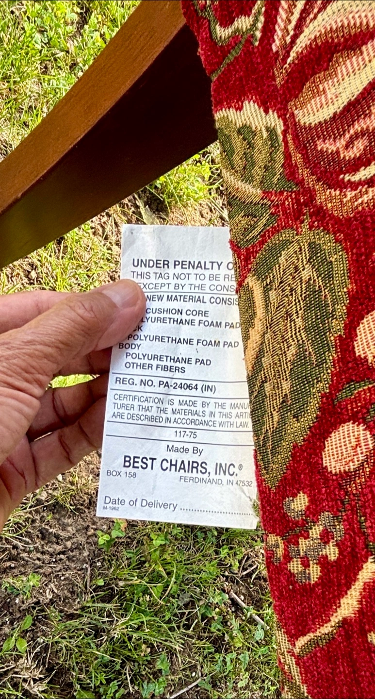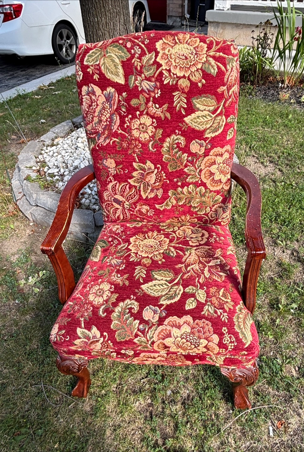 97Selling a lovely carved wood floral accent chair from Best Chairs Inc. It features a beautiful red floral pattern and wooden armrests. Perfect for adding a touch of elegance to any room!