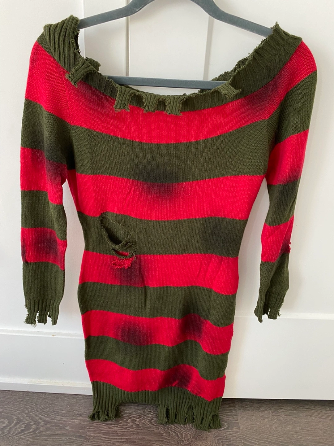 Selling a sweater dress Halloween costume from A Nightmare on Elm Street! It's red and green striped, and has a distressed look. Perfect for a Halloween party or a horror movie fan!
