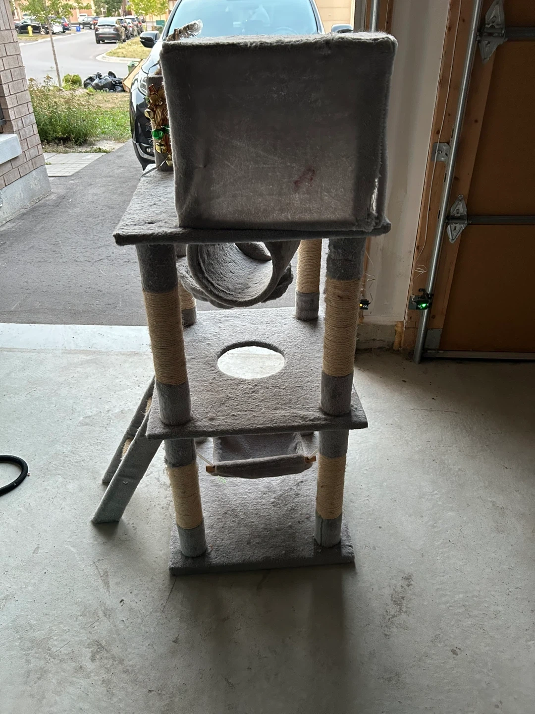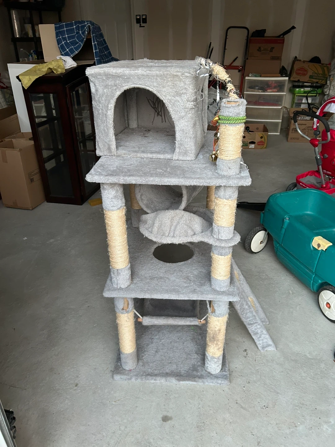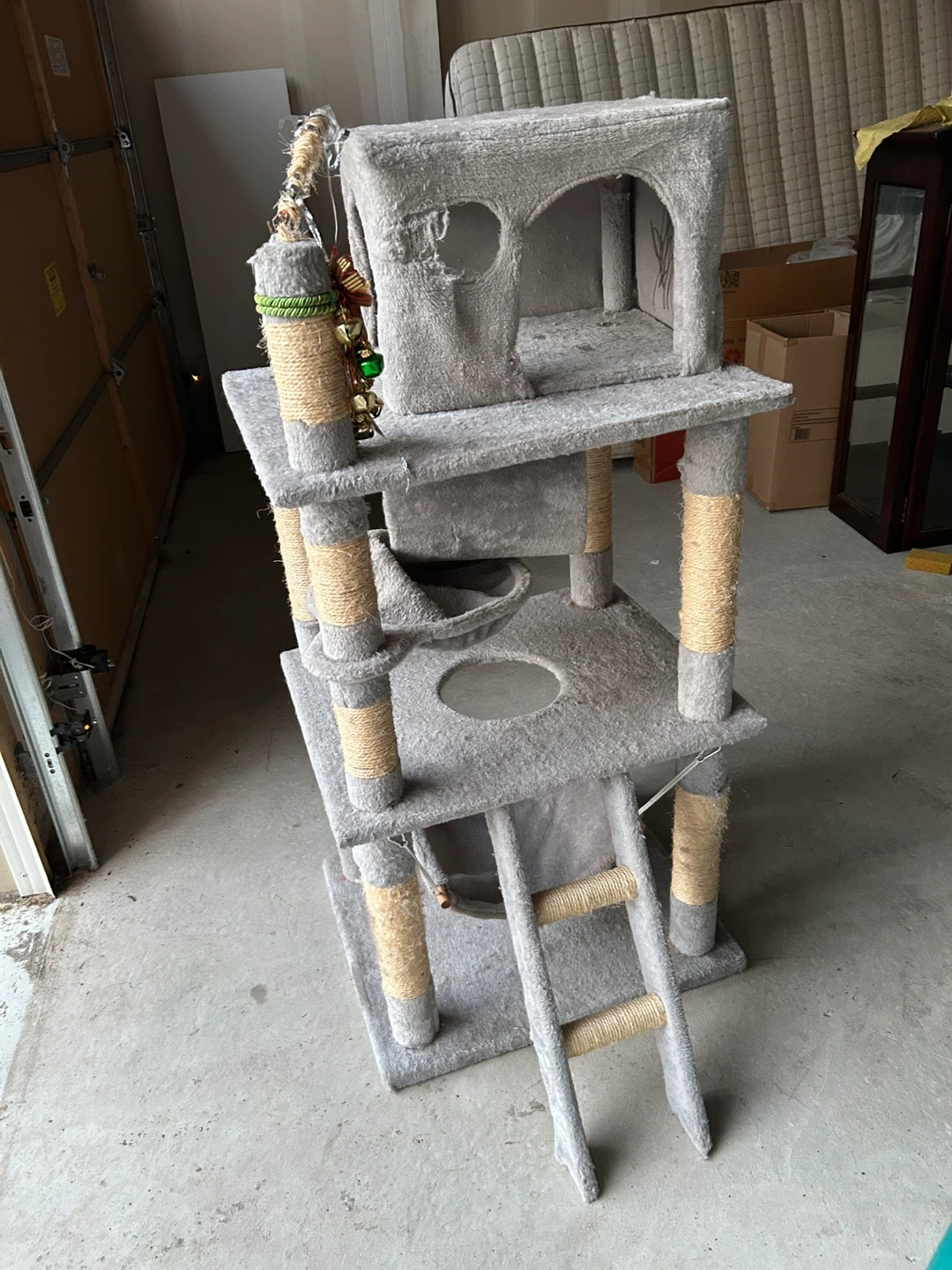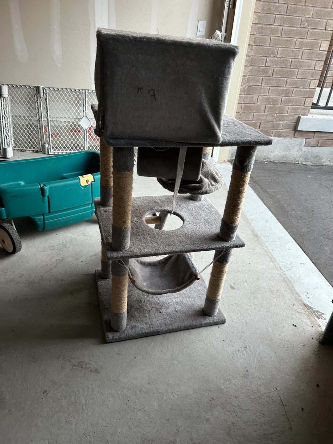 Selling a grey cat tree that's perfect for your feline friend! It features multiple levels for climbing and lounging, plus scratching posts to keep their claws healthy. It's in great condition and ready for a new home