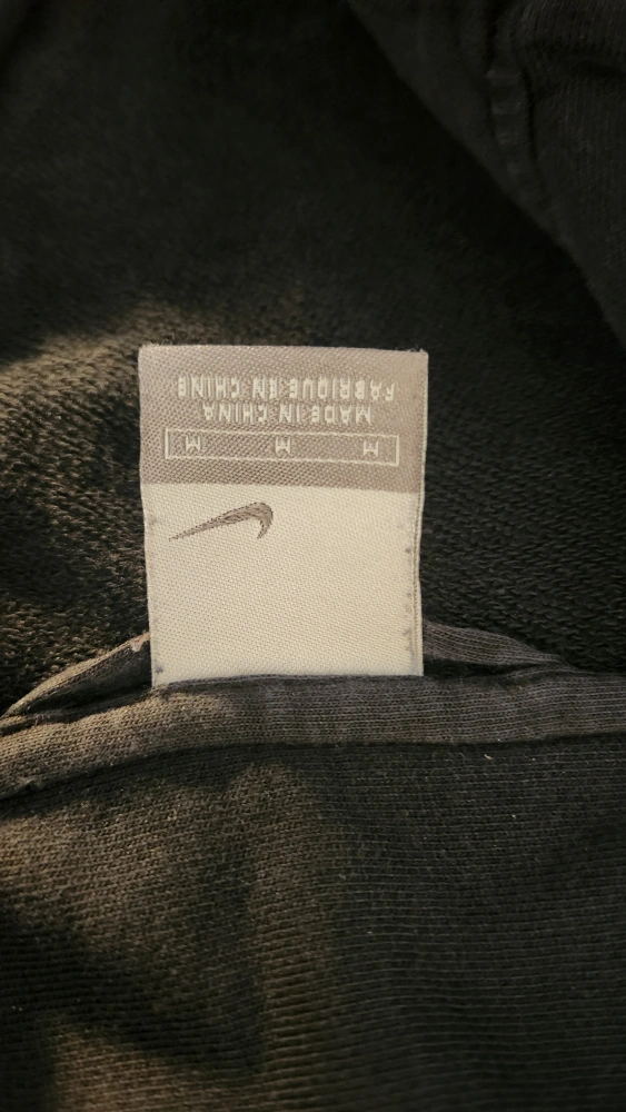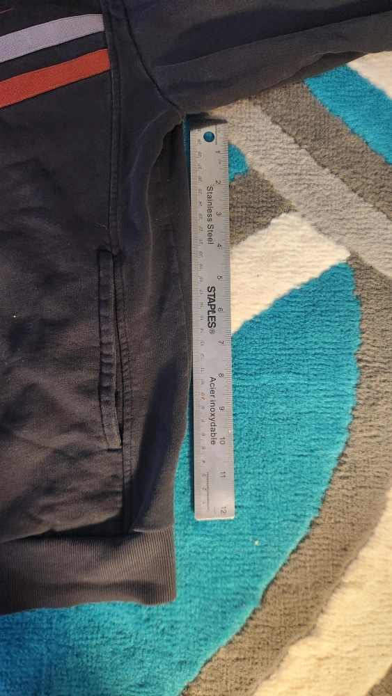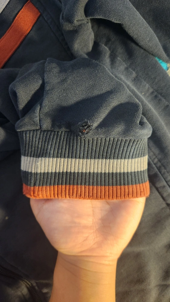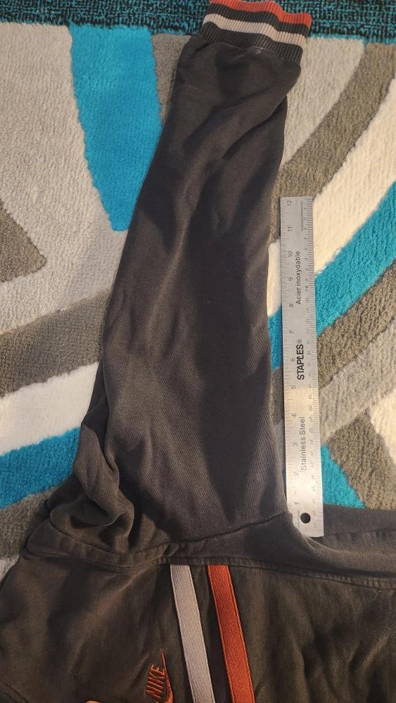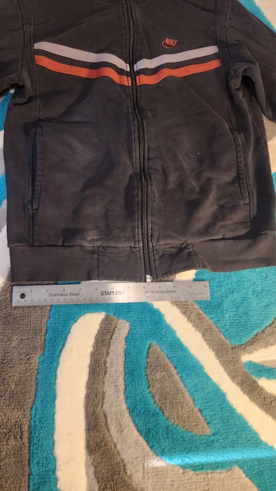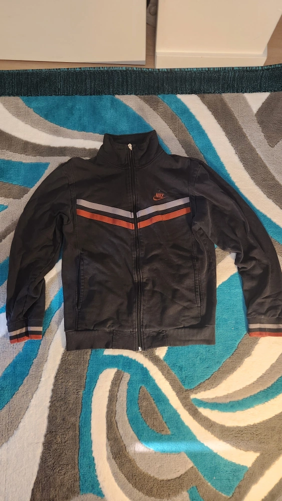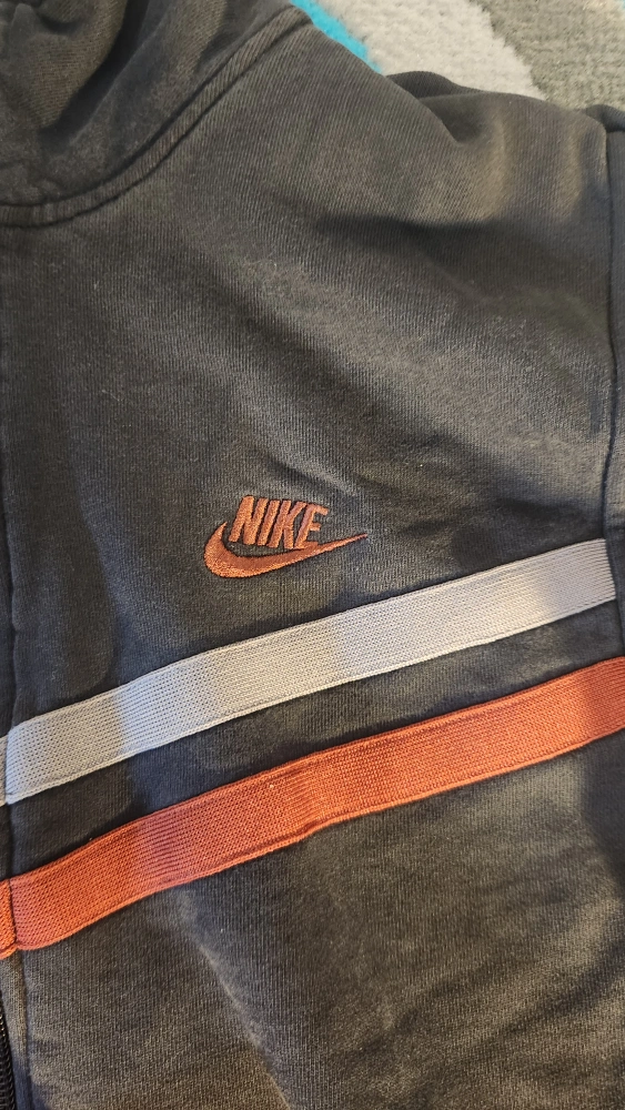 Selling a Nike full zip jacket in size medium. It's black with orange and grey stripes. There is a small hole in the wrist cuff, as shown in the photos.