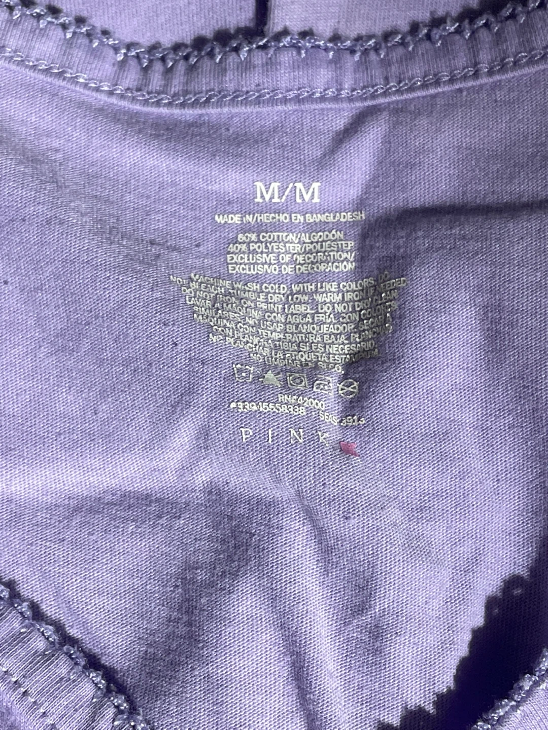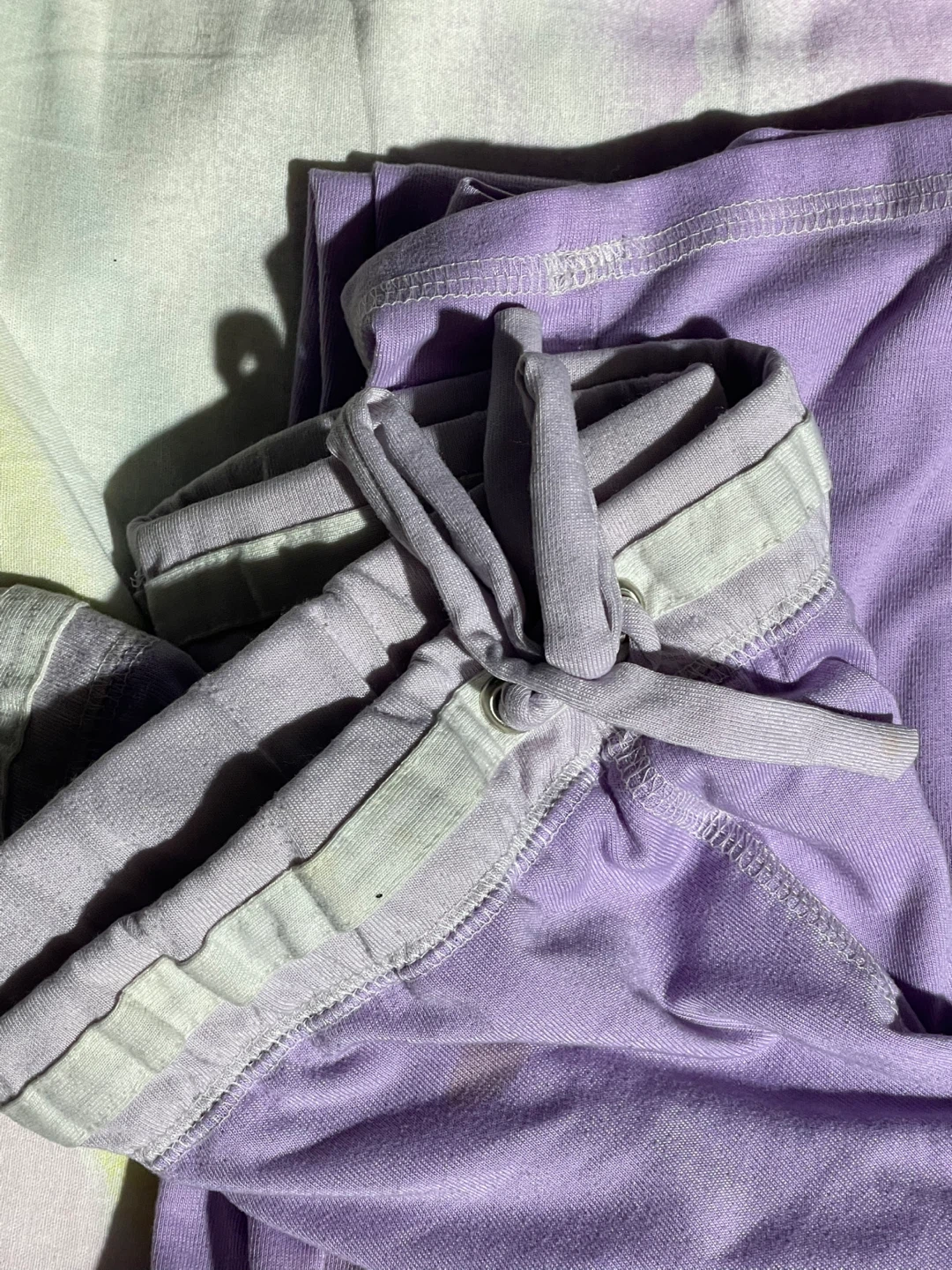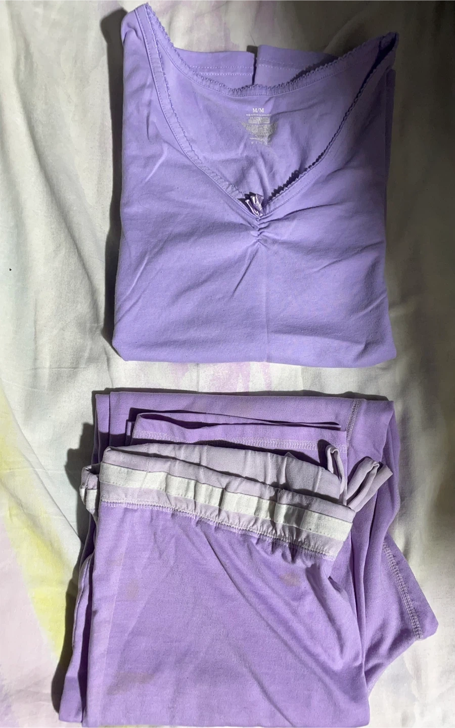 Donating a pajama set in lavender! The set is size M and made of a comfortable material, perfect for lounging or sleeping. It's in fair condition and ready for a new home!