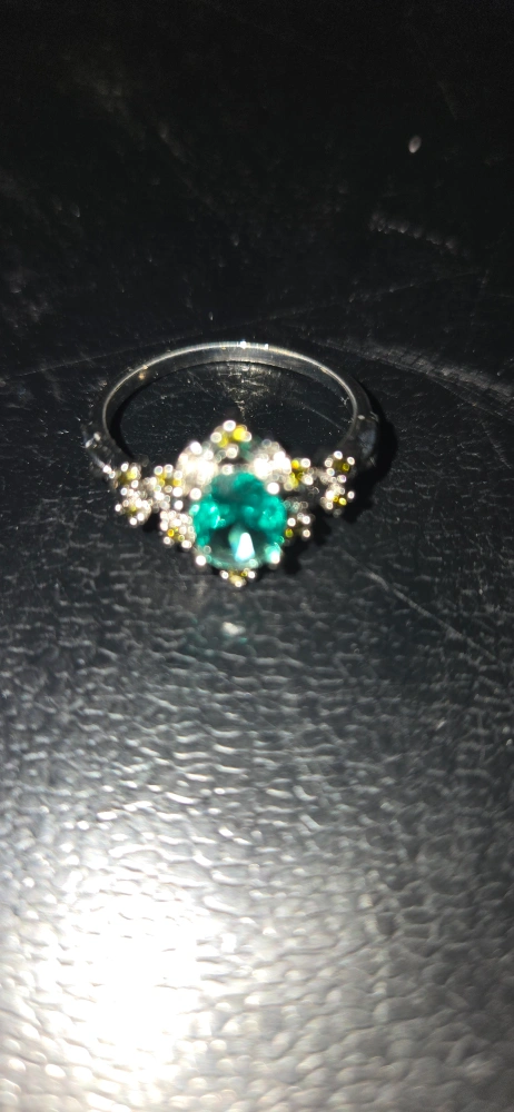 This is a beautiful ring with an emerald green gemstone. It features a silver band and is surrounded by smaller white and yellow stones. It would make a lovely gift silver ring