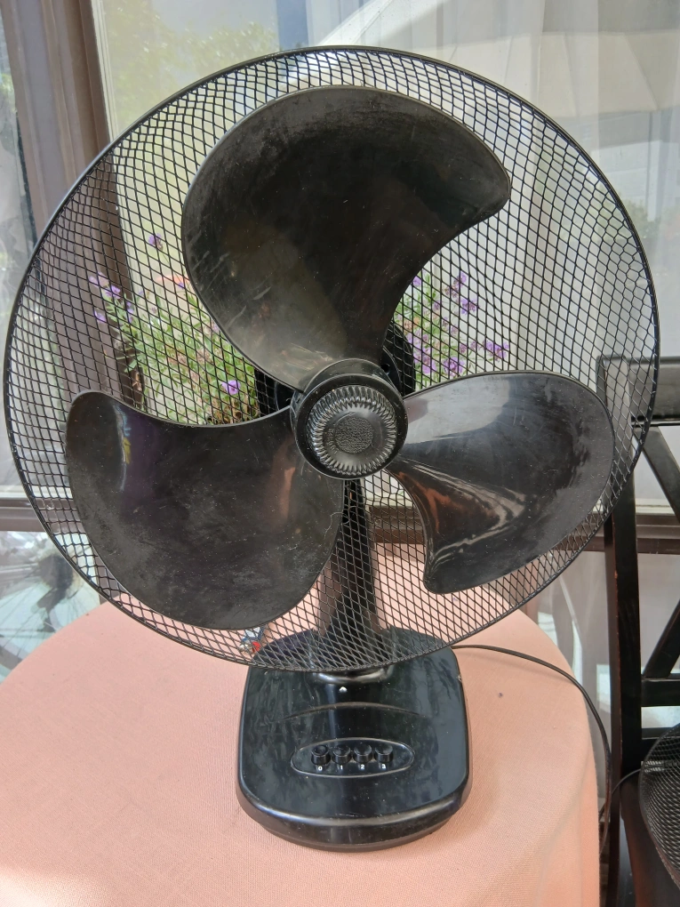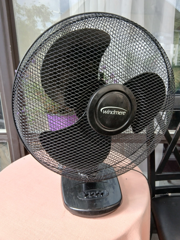 Here's a Windmere table fan in black. It's perfect for keeping cool on a hot day. It has a classic design and would look great in any room. It shows signs of use.