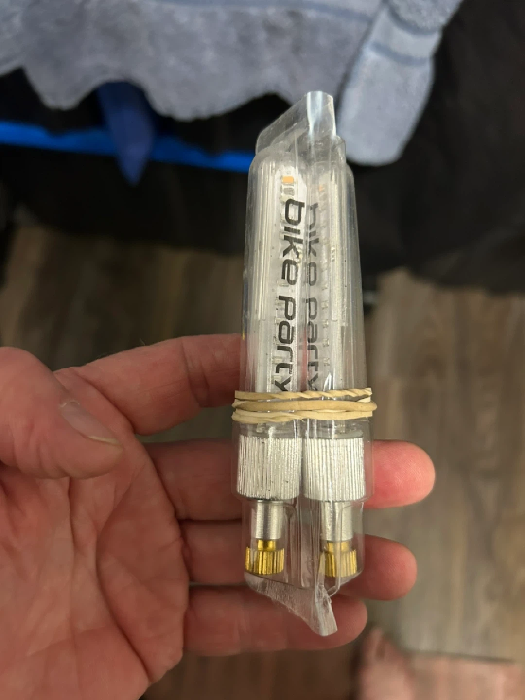 Selling a pair of Bike Party LED valve cap lights! They're brand new and still in the original packaging. These lights add a fun and safe touch to your bike rides, making you more visible at night. Perfect for adding some flair to your wheels!