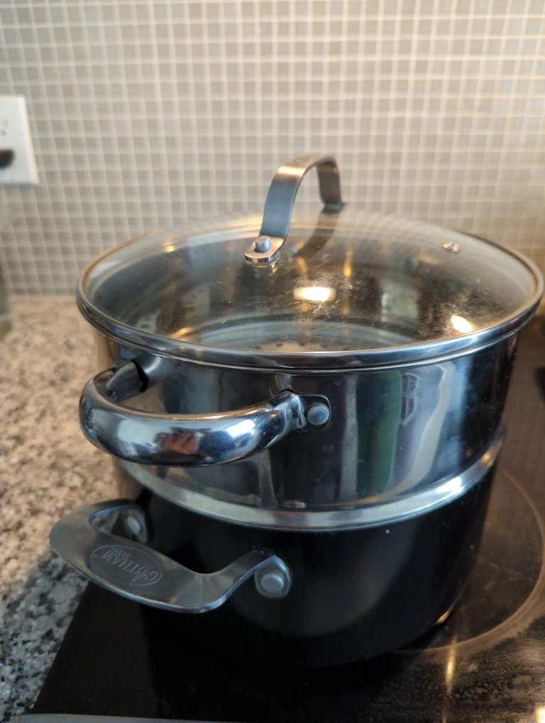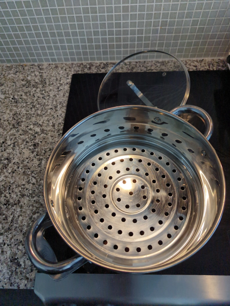 This is a stainless steel steamer pot that is in great condition. It comes with a glass lid so you can easily see how your veggies are steaming! The steamer insert has lots of holes for even steaming. Perfect for healthy cooking