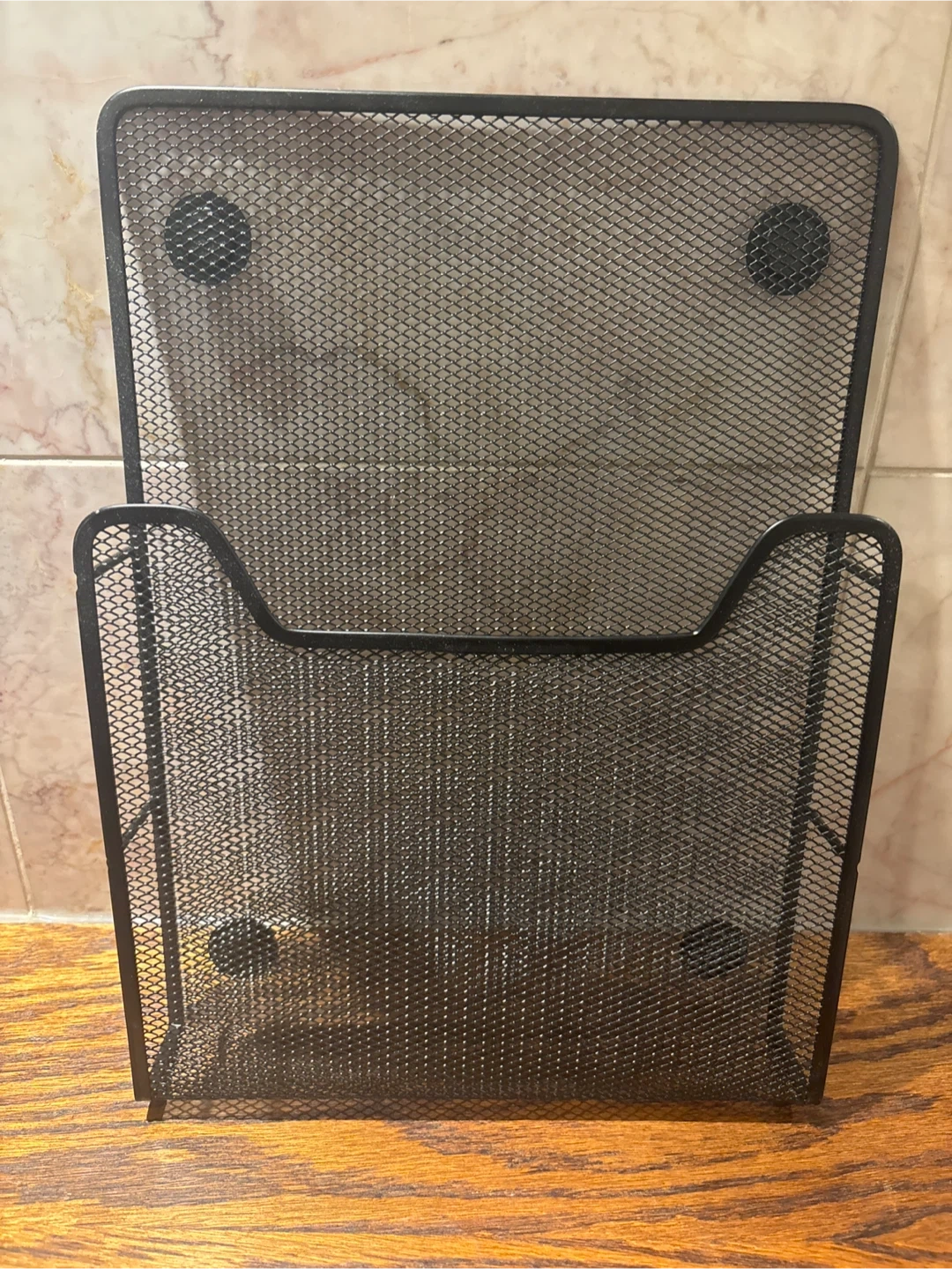 Selling a handy black mesh wall file organizer! It's perfect for keeping your documents and papers tidy and easily accessible. Great for a home office or study space. Can be used at desk or in locker. Magnets work