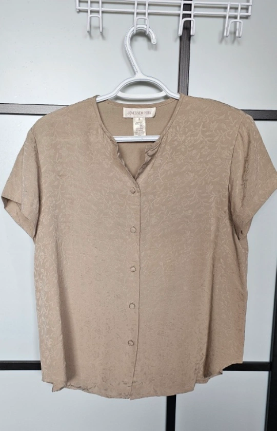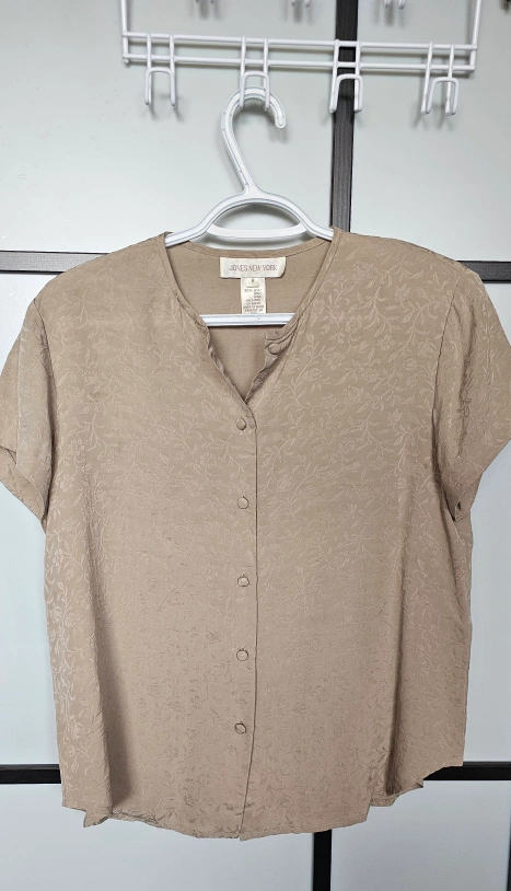 Jones New York blouse Subtle beige floral pattern. Size 8 or Medium Button-down front with short sleeves Perfect for a casual or work outfit! Lightly Used no defects or tears