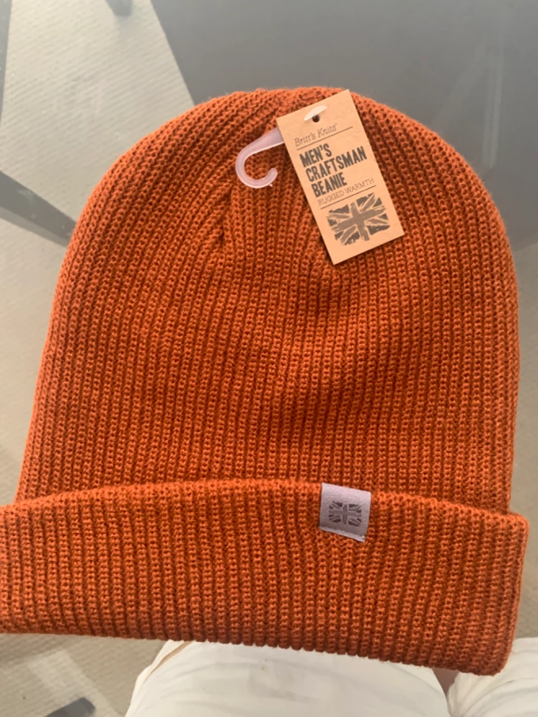 Check out this Britt's Knits Craftsman Beanie! It's a cozy beanie perfect for keeping you warm on those chilly days. The tag says it offers rugged warmth, so you know it's ready for anything. It comes in a nice orange colour.