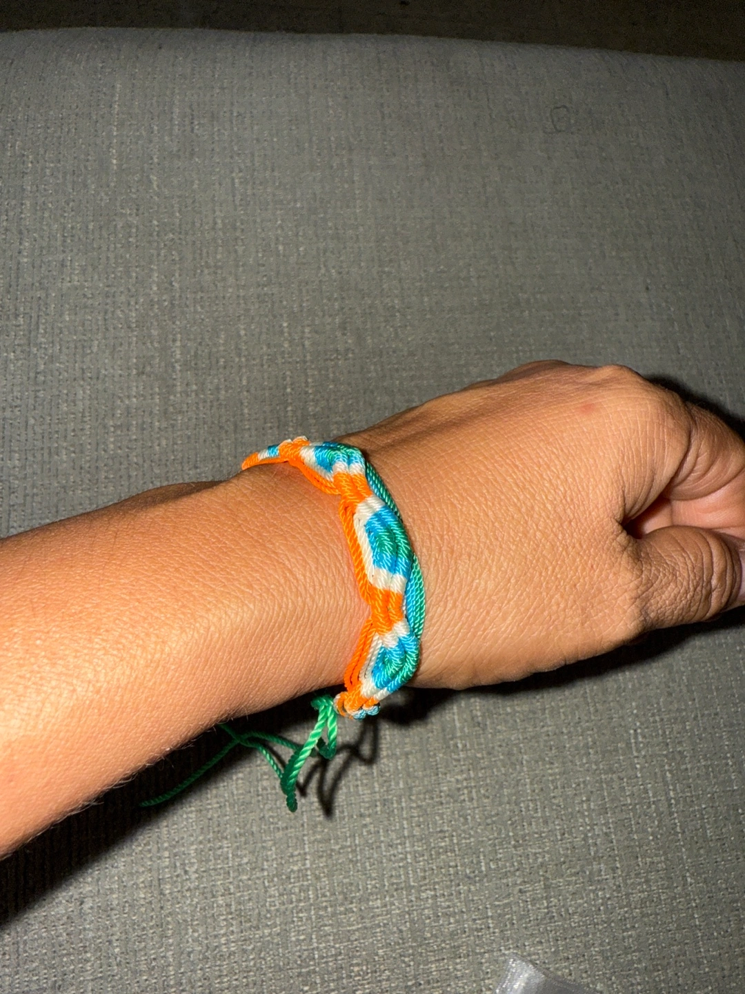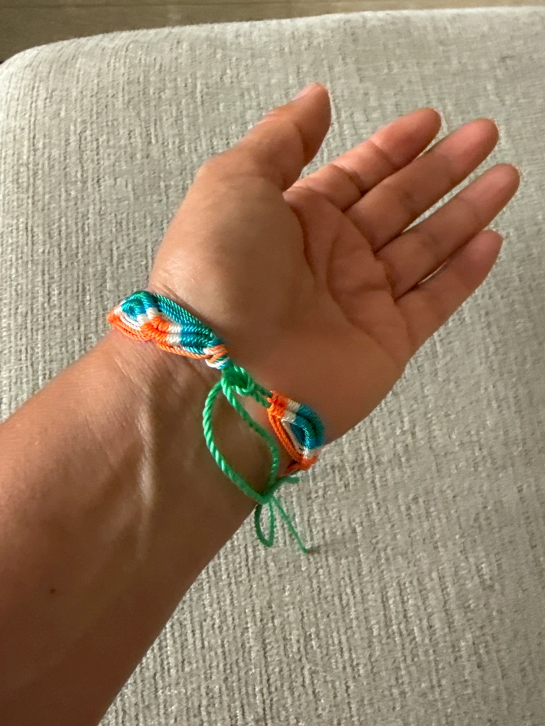 Selling a handmade braided bracelet. It features a colorful pattern with orange, blue, and green threads. It's in great condition and ready to add a pop of color to your wrist