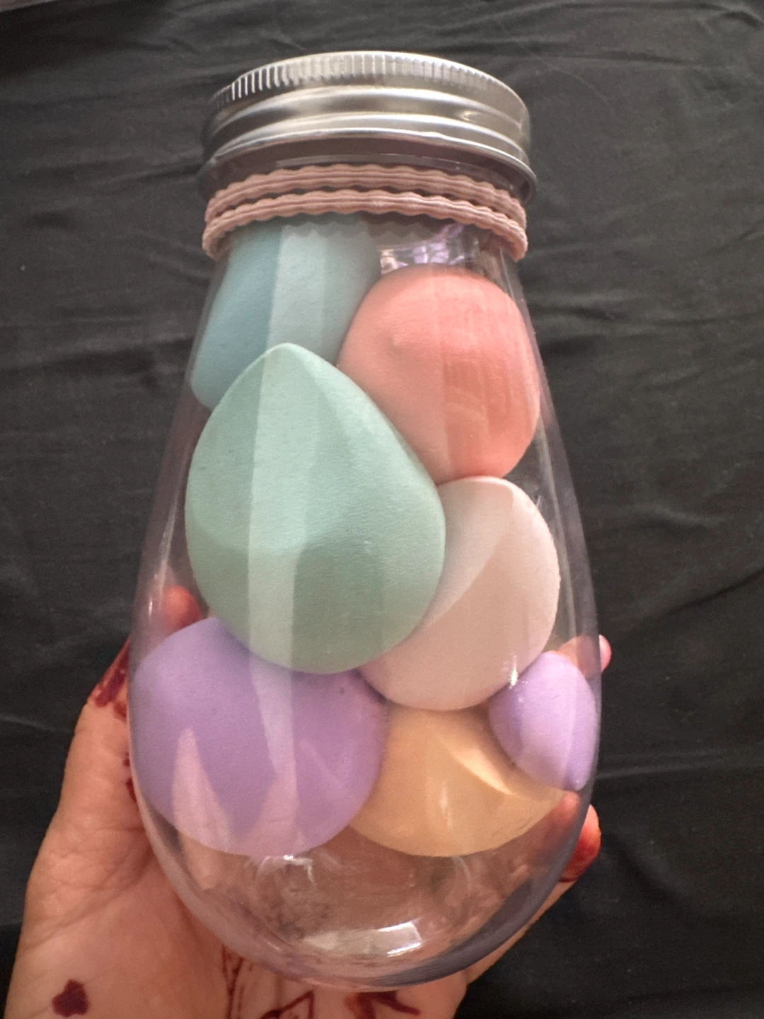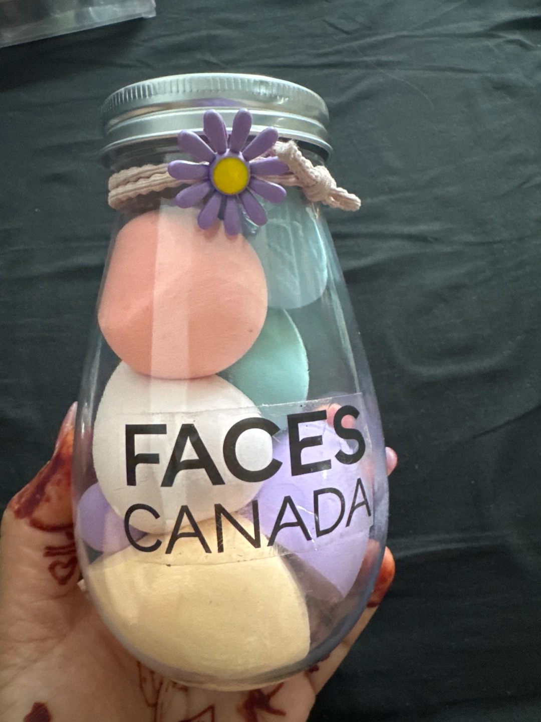 I'm selling a jar of makeup sponges from Faces Canada. They come in a variety of pastel colours. Great for applying foundation, concealer, or for blending