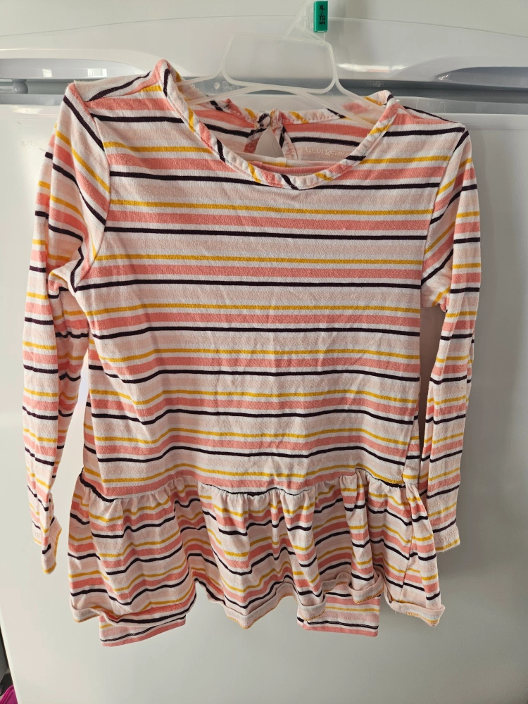 This adorable George peplum top and pants are perfect for your little one! It features a cute striped pattern in pink, white, yellow, and black. The size is 4T and it's made of 100% cotton, so it's soft and comfy for everyday wear