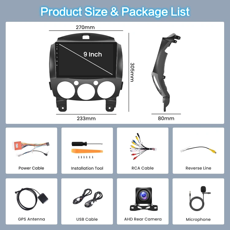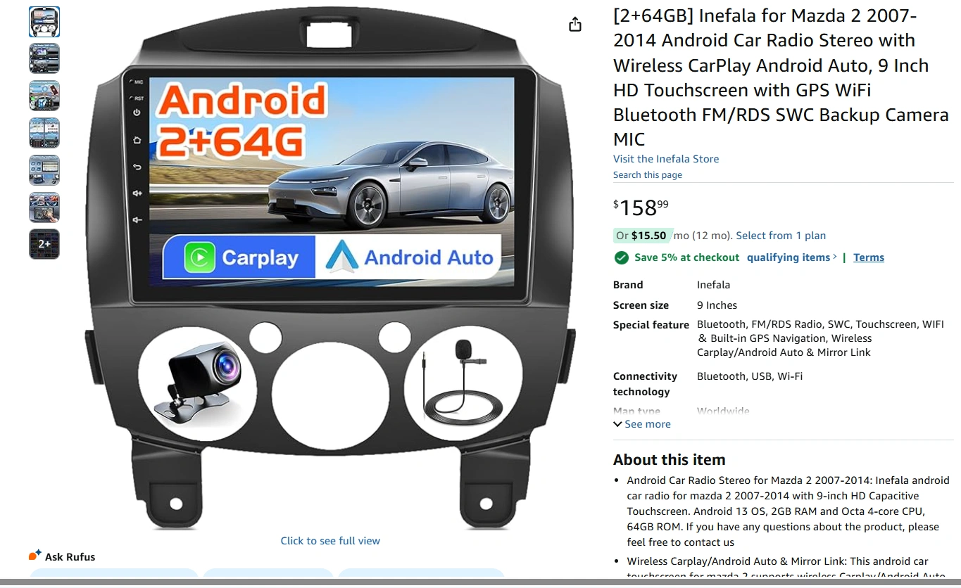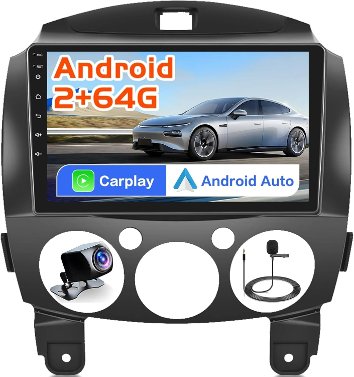 Mazda 2 2007-2014 Android Car Radio Stereo with Wireless CarPlay Android Auto, 9 Inch HD Touchscreen with GPS WiFi Bluetooth FM/RDS SWC Backup Camera MIC, Brand New in the Box/Sealed Features: Android Car Radio Stereo for Mazda 2 2007-2014: Inefala android car radio for mazda 2 2007-2014 with 9-inch HD Capacitive Touchscreen. Android 13 OS, 2GB RAM and Octa 4-core CPU, 64GB ROM. If you have any questions about the product, please feel free to contact us Wireless Carplay/Android Auto & Mirror Link: This android car touchscreen for mazda 2 supports wireless Carplay/Android Auto, allowing you to use your phone to make calls, use maps and listen to music while driving. Mirror Link support also lets you access maps, videos and more directly from your phone on the display WIFI & Built-in GPS Navigation: The carplay radio for mazda 2 easily connects to wifi so you can watch online videos or provide accurate real-time location and gps navigation while supporting gps using mapping applications such as google maps and waze Bluetooth, FM/RDS Radio: This android car stereo for mazda 2 comes with Bluetooth ensures faster data transmission speeds, enabling hands-free calling, phonebook downloads, and music streaming. Enjoy the FM/RDS radio with 30 preset stations to explore everything from news to music More Functions: This android car head unit for mazda 2 offers steering wheel controls to keep you safer while driving. Package includes free reverse camera and external microphone as a gift