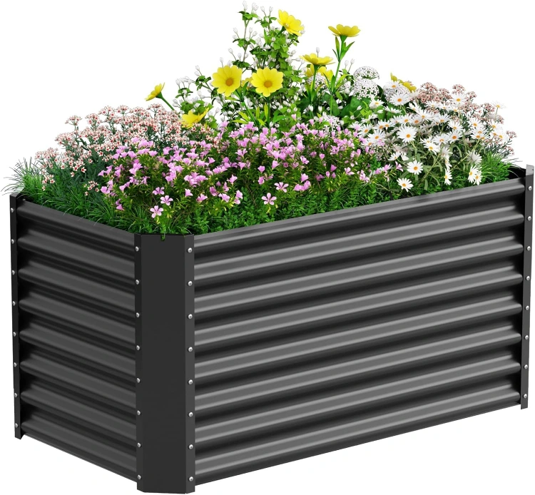 【Distinctive Design】-Outdoor elevated garden beds, our custom design style features galvanized sheet metal on the top, a stainless steel frame on the middle base, and the lower four corners are made of heavy-duty steel with a black powder-coated finish,This combination exceeds the lifespan of wooden products and ensures excellent rust resistance to keep the garden bed in the best condition for a long time.