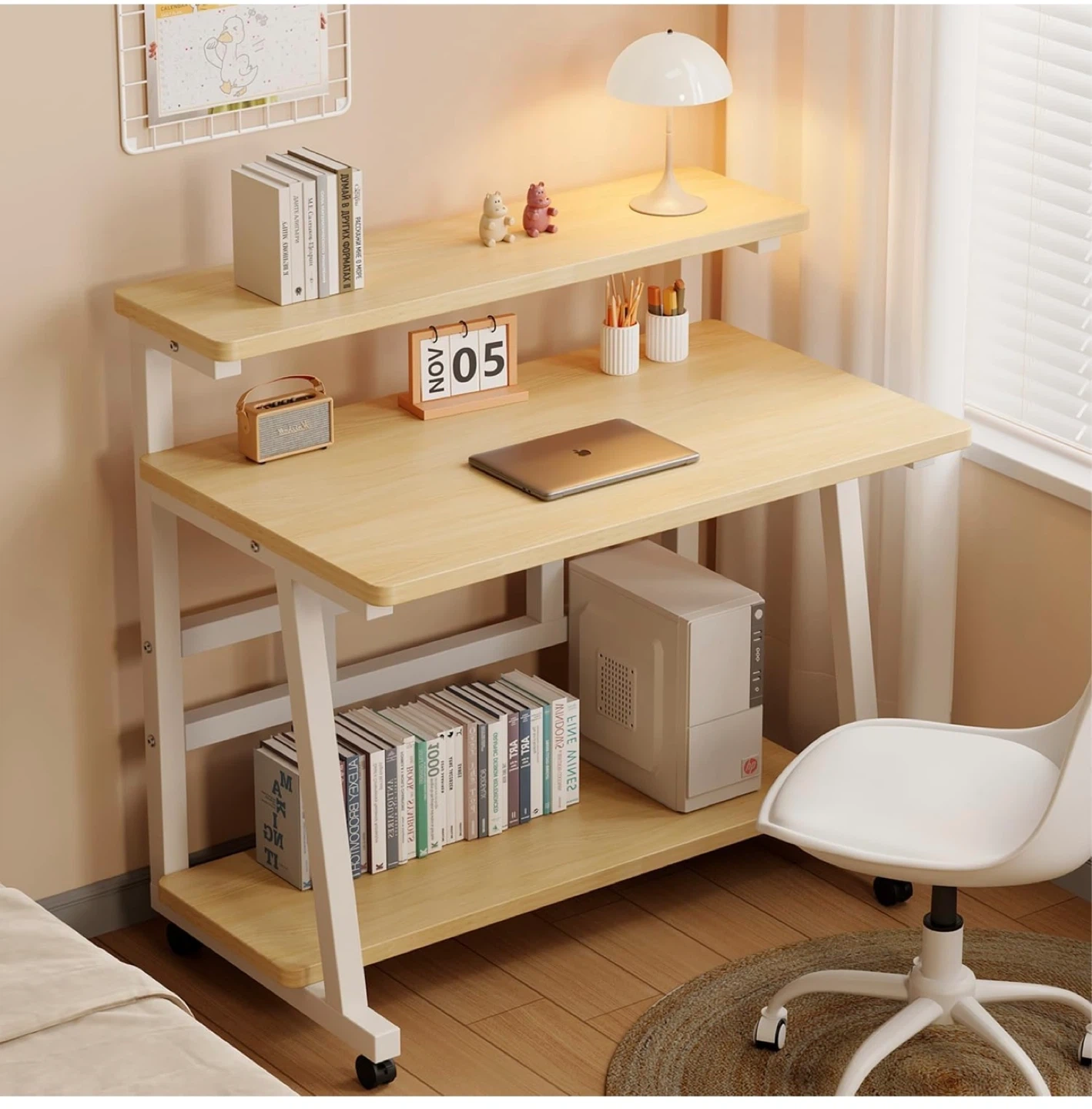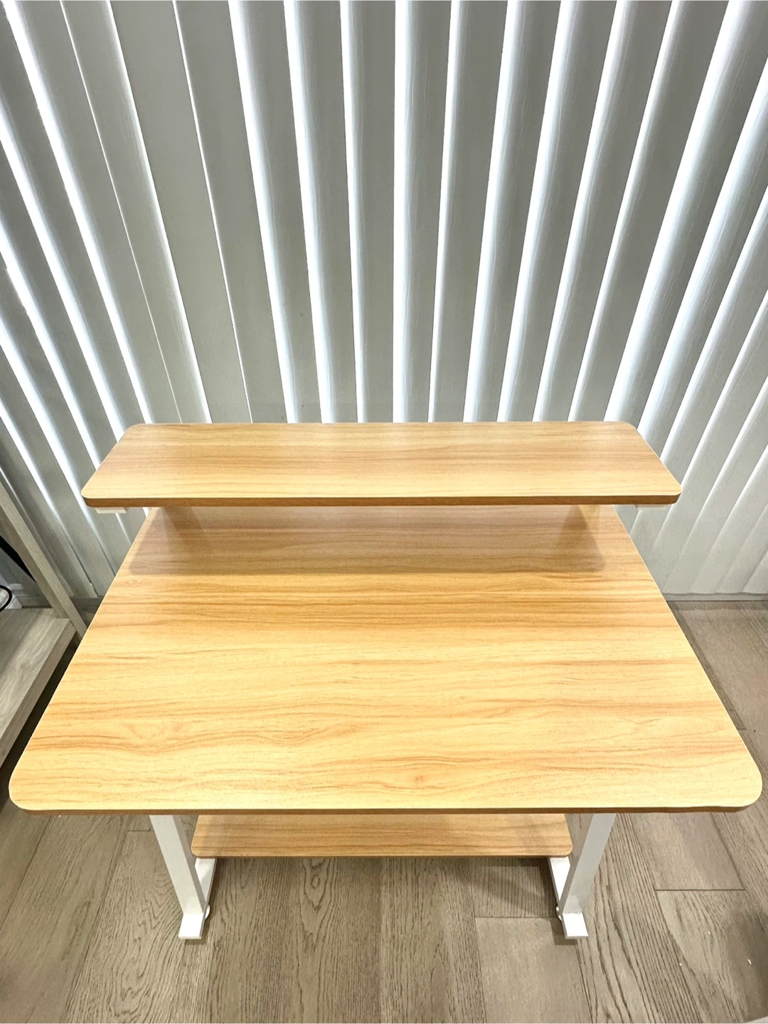 Looking to sell this computer desk with shelves. It features a frame in white and a board in teak colour. The size is 31.5" x 19.7". Perfect for a small space or home office!