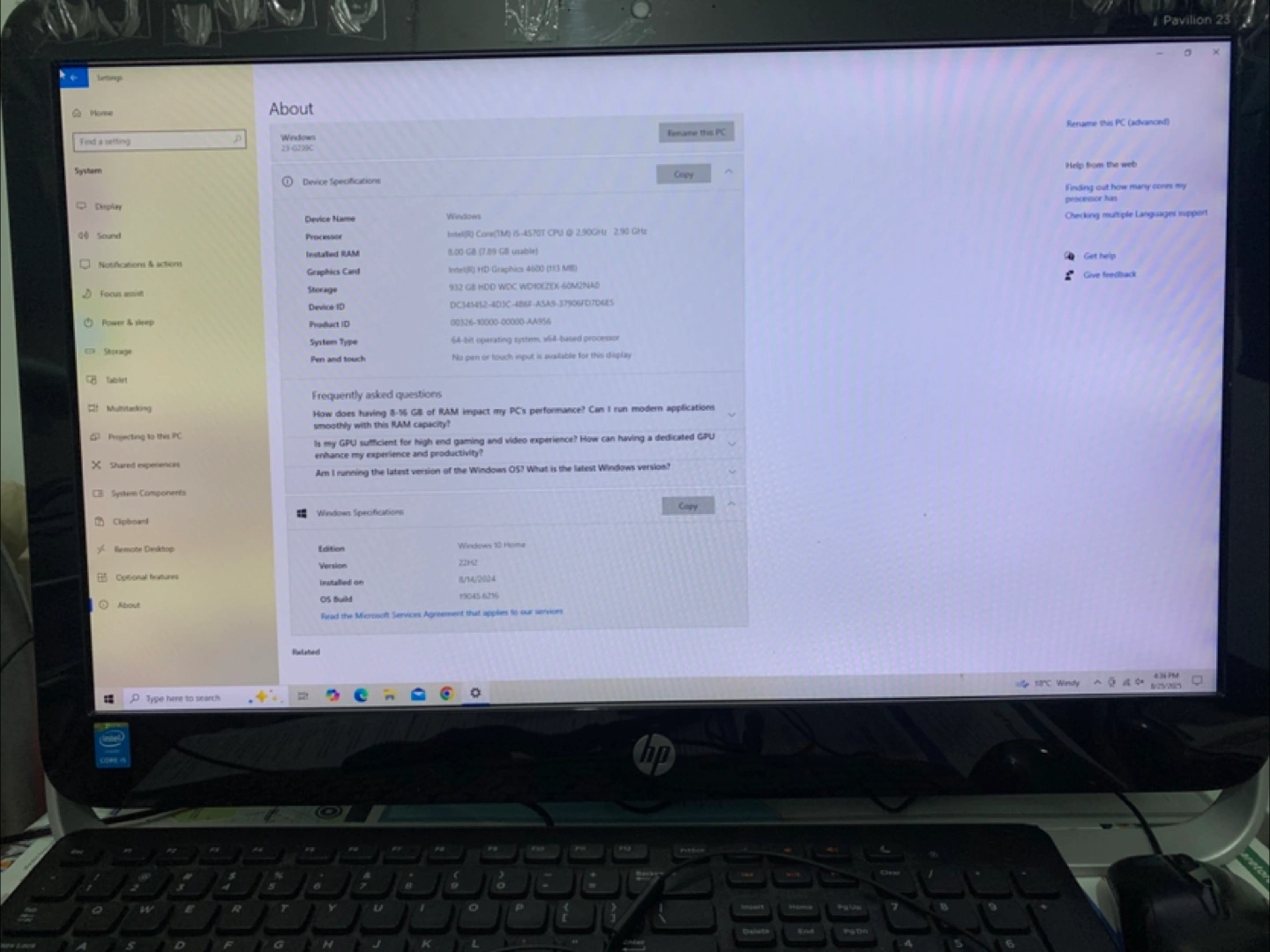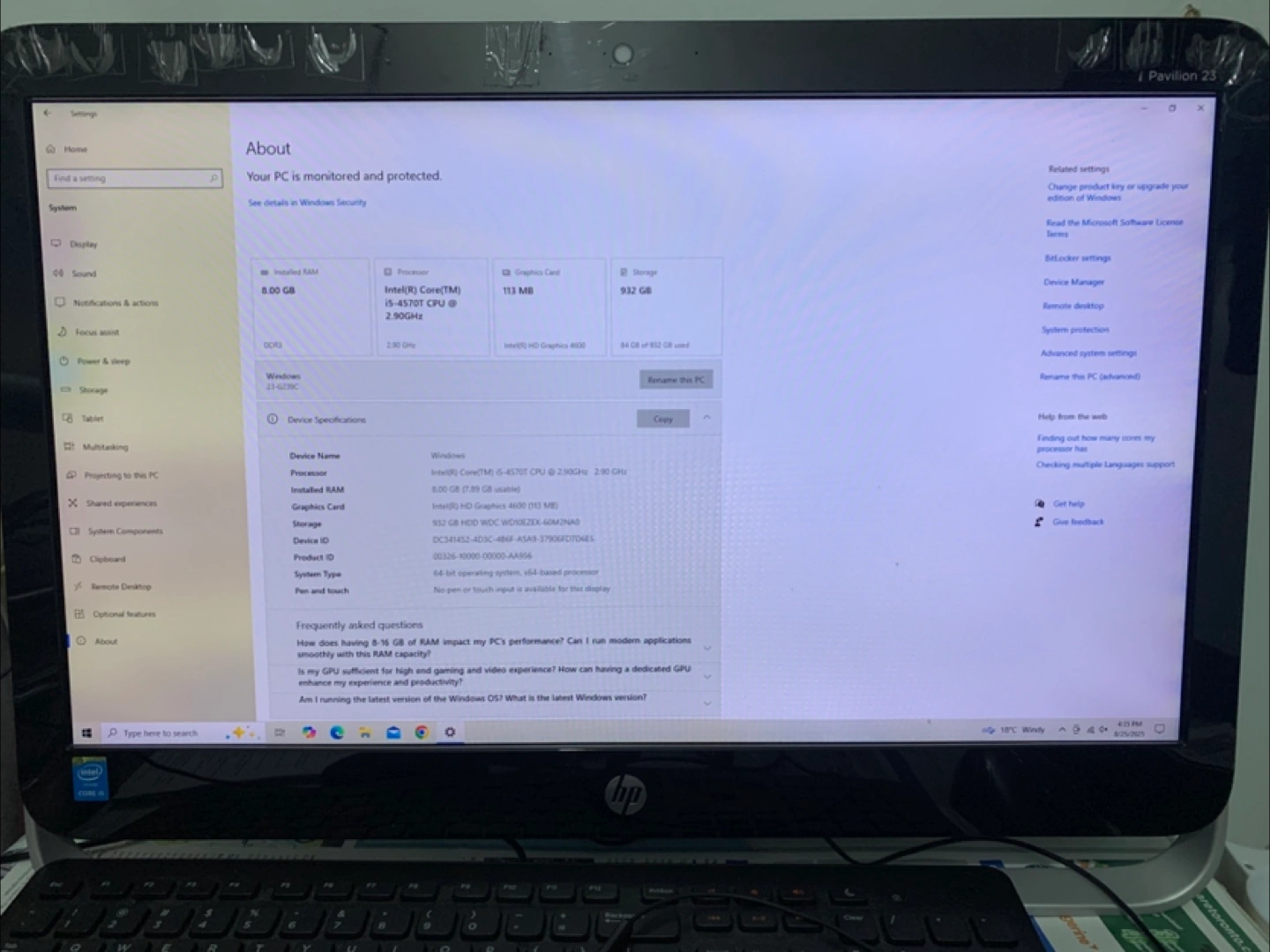 Selling a used HP Pavilion 23 All-in-One desktop computer. It comes with: - Intel Core i5-4570T CPU @ 2.90 GHz - 8.00 GB RAM - Intel HD Graphics 4600 - 1TB HDD - Windows 10 Home