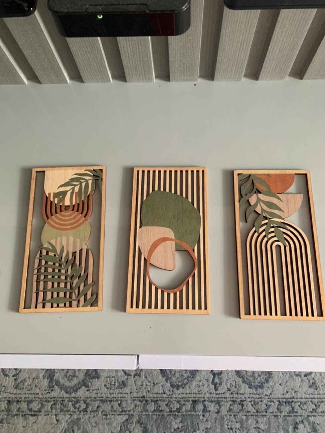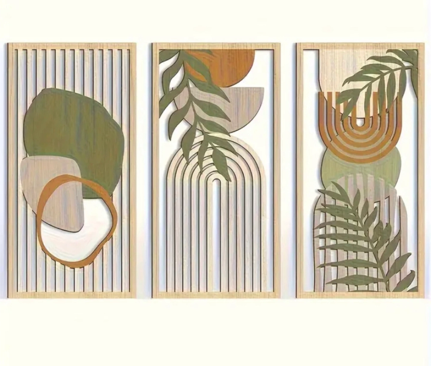 Spruce up your space with this set of three wooden wall art panels! They feature unique abstract designs with a natural wood finish and a touch of green. Perfect for adding a modern, earthy vibe to any room in your home