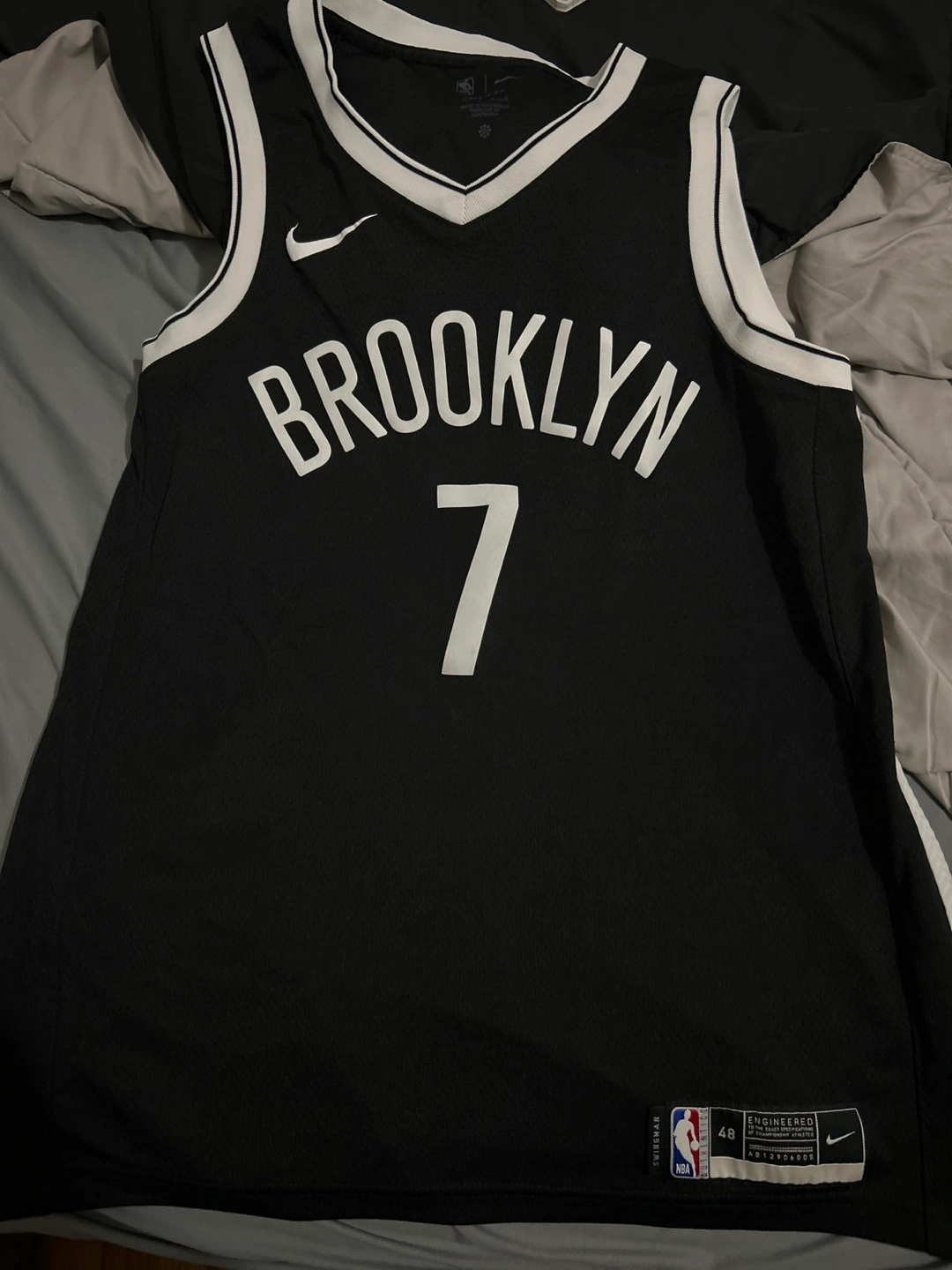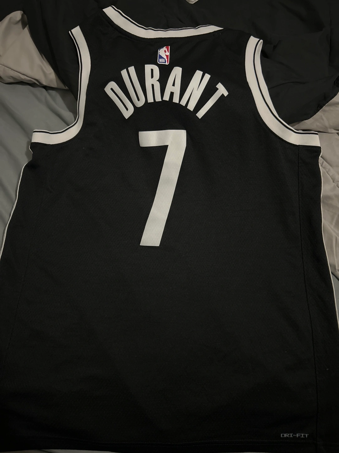 647Selling a Nike Brooklyn Nets Kevin Durant #7 jersey in size Large. It's black with white lettering and trim. The jersey is in good condition and ready for a new fan!