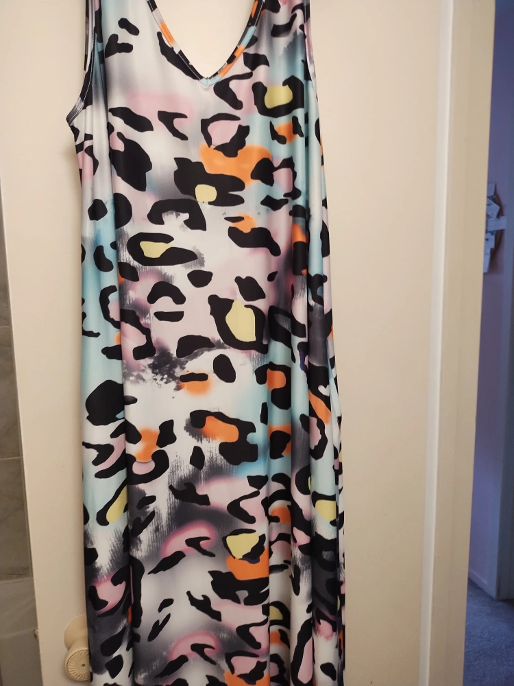 This dress features a vibrant prints design with a mix of colours including black, orange, yellow, and blue. It has a V-neck and sleeveless style, perfect for summer days for cool and comfy. Size L to XL