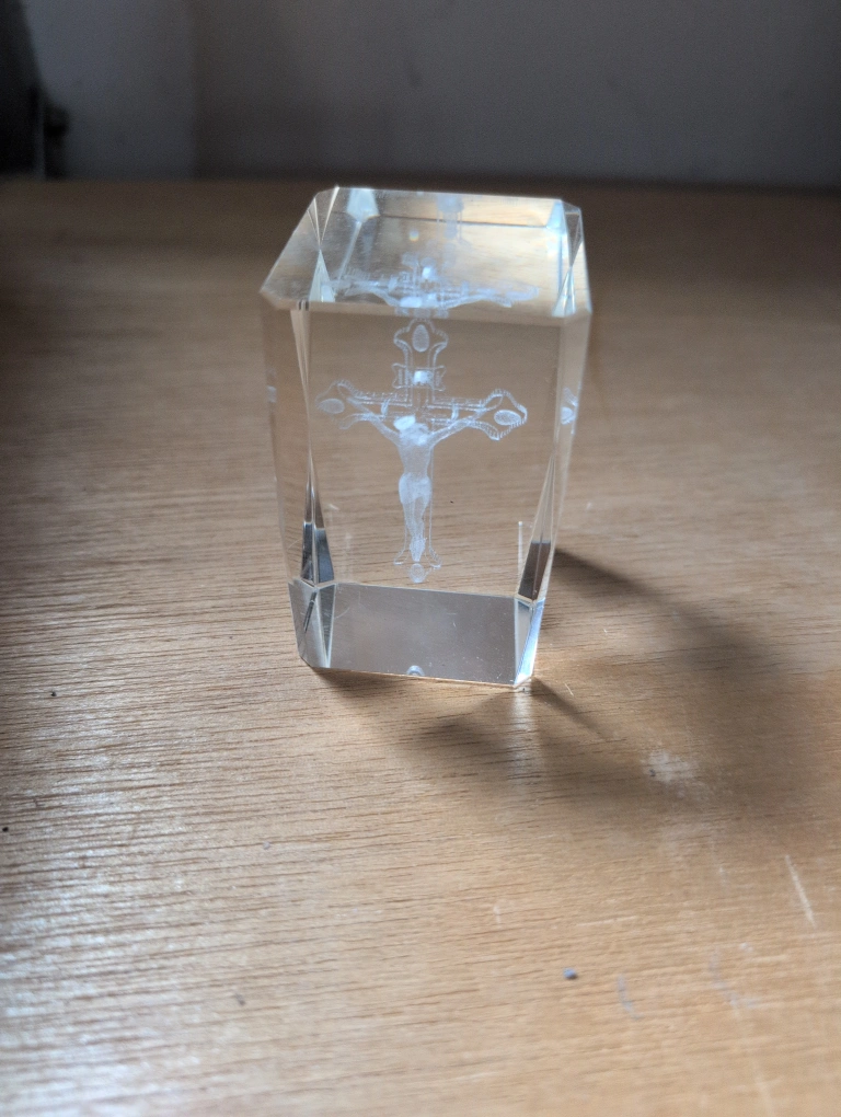 This is a crystal ornament with a religious figure etched inside! It's in great condition and would be perfect for a desk or shelf. Pickup at Markham intersection of 16th Ave and BurOak