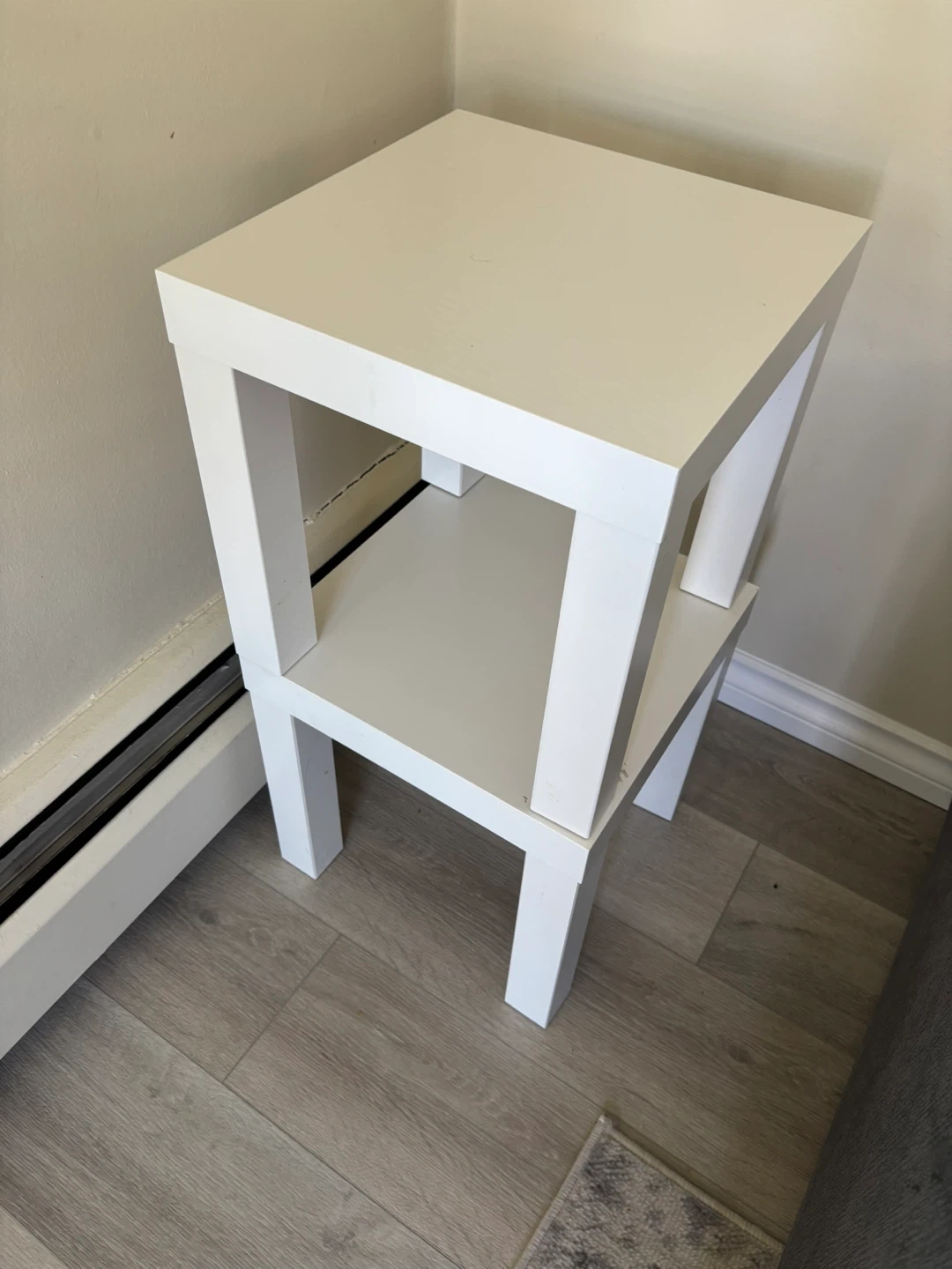 Selling two white side tables from IKEA. They’ve been used but are in fairly good condition with some minor signs of wear.