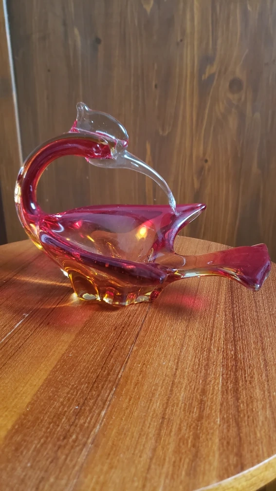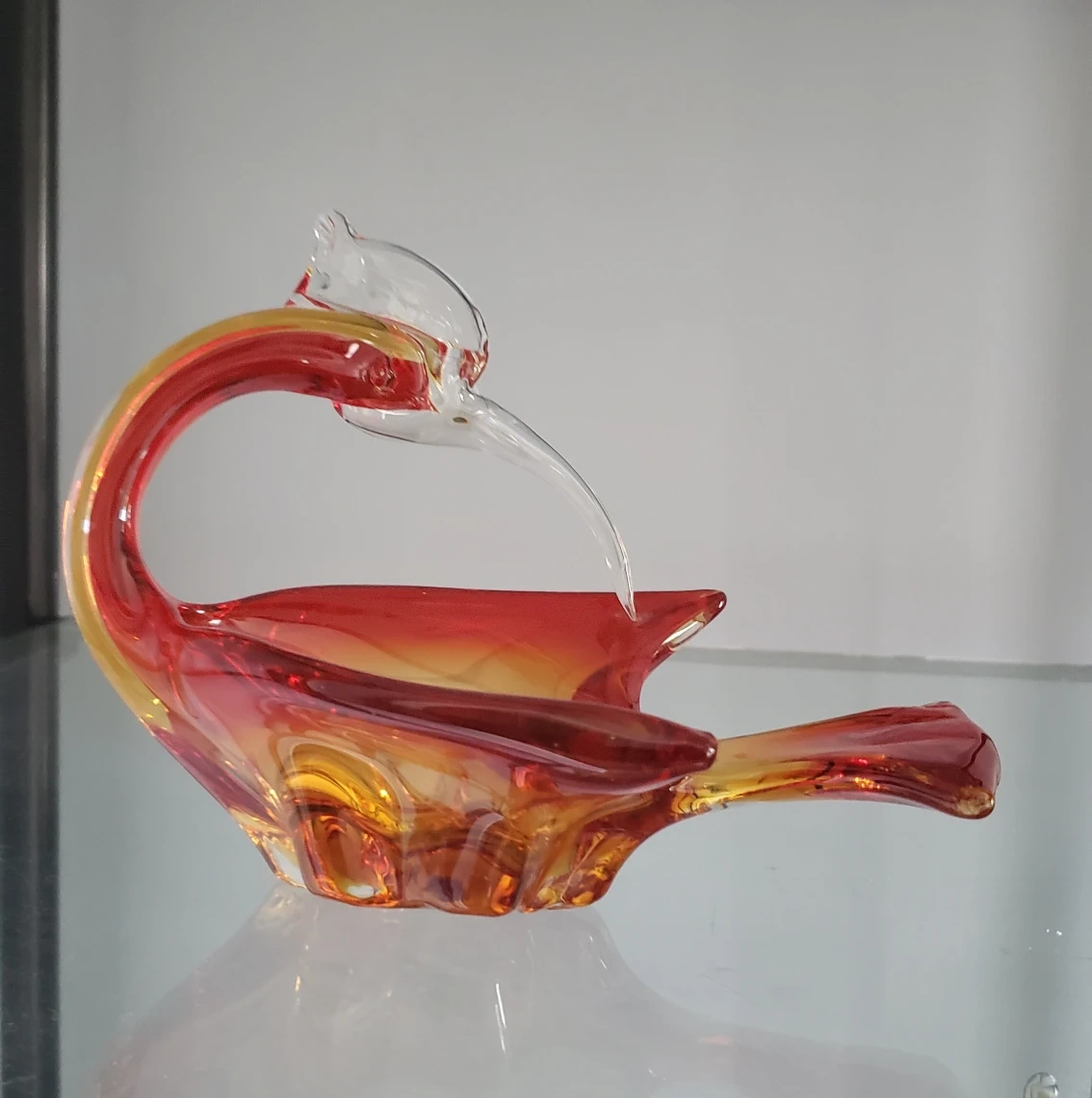 Unique red to amber art glass bird figurine. It's in great condition and would look lovely on a shelf or table! JI. Co. Ltd. Murano 9" x 6.5" x 6"