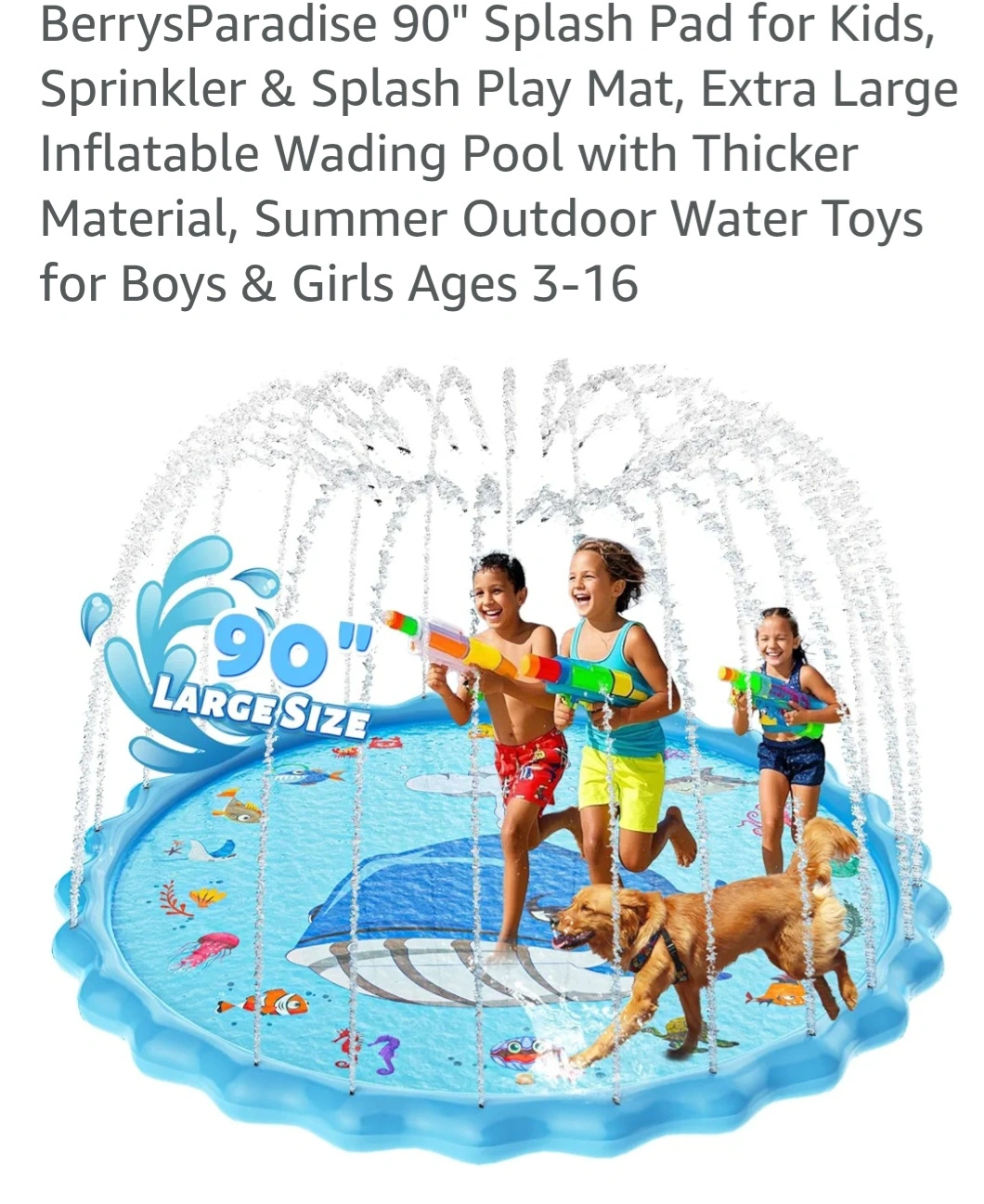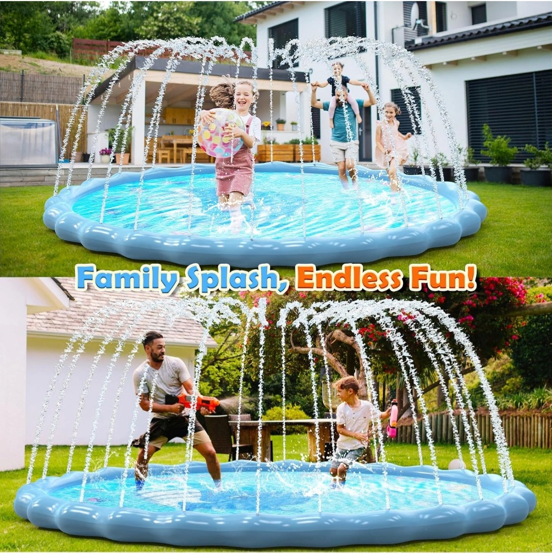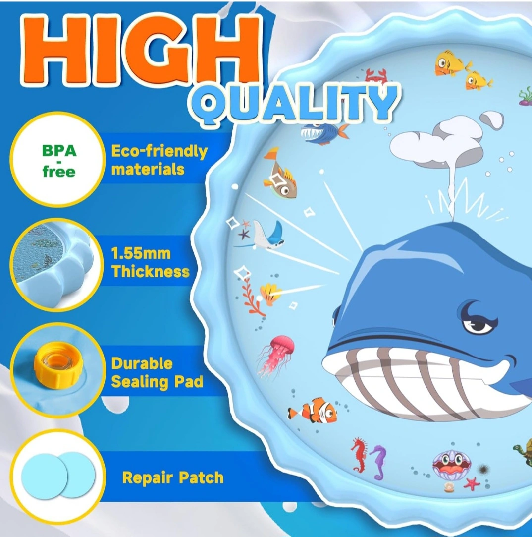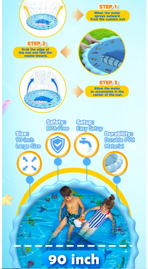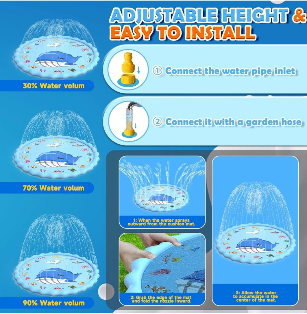 Get ready for some fun with this High Quality, 90-inch splash pad! It's easy to install, just connect it to your garden hose. The height is adjustable, so you can control the water volume. Perfect for kids and parents to splash around and have fun.