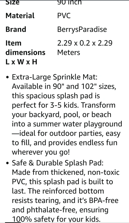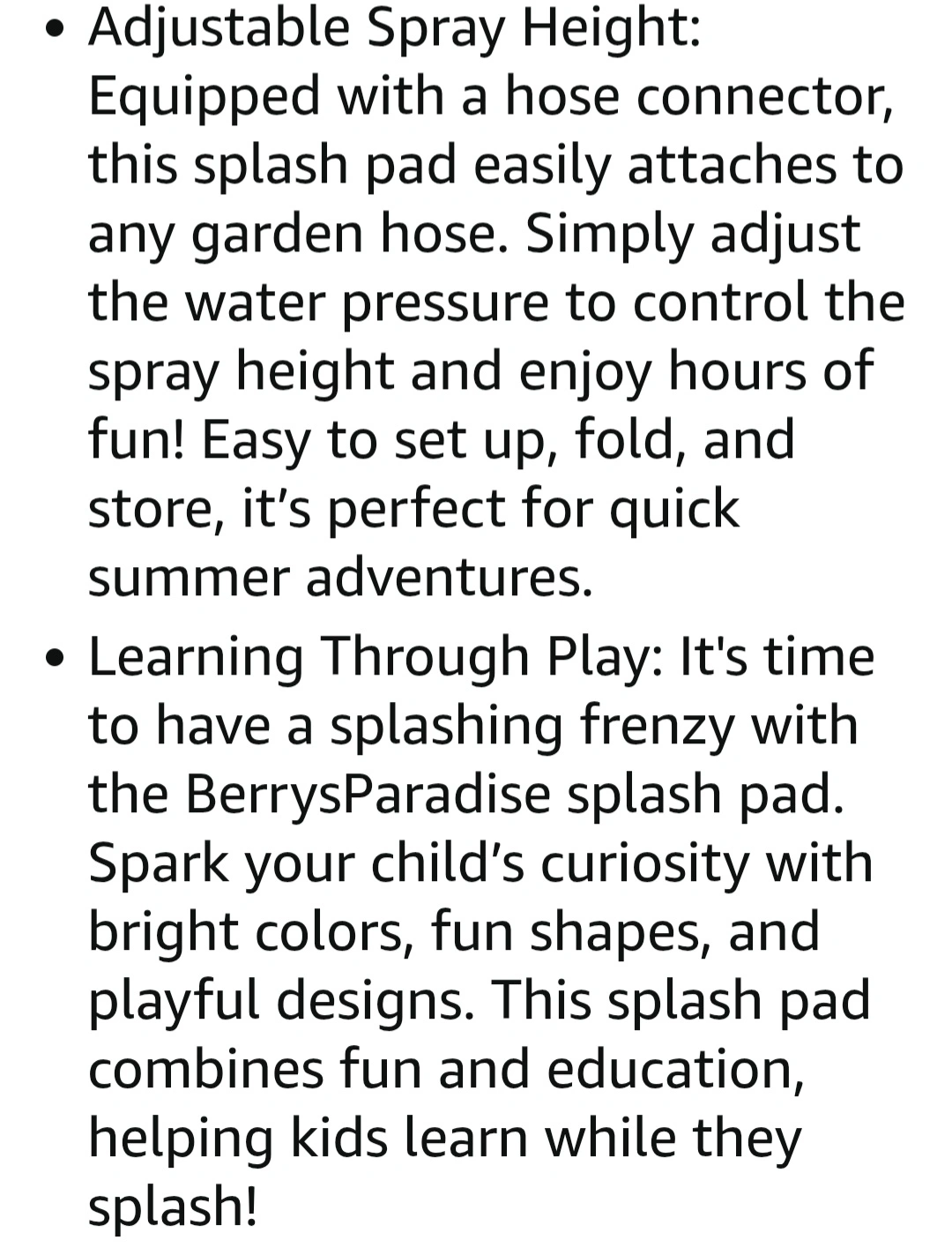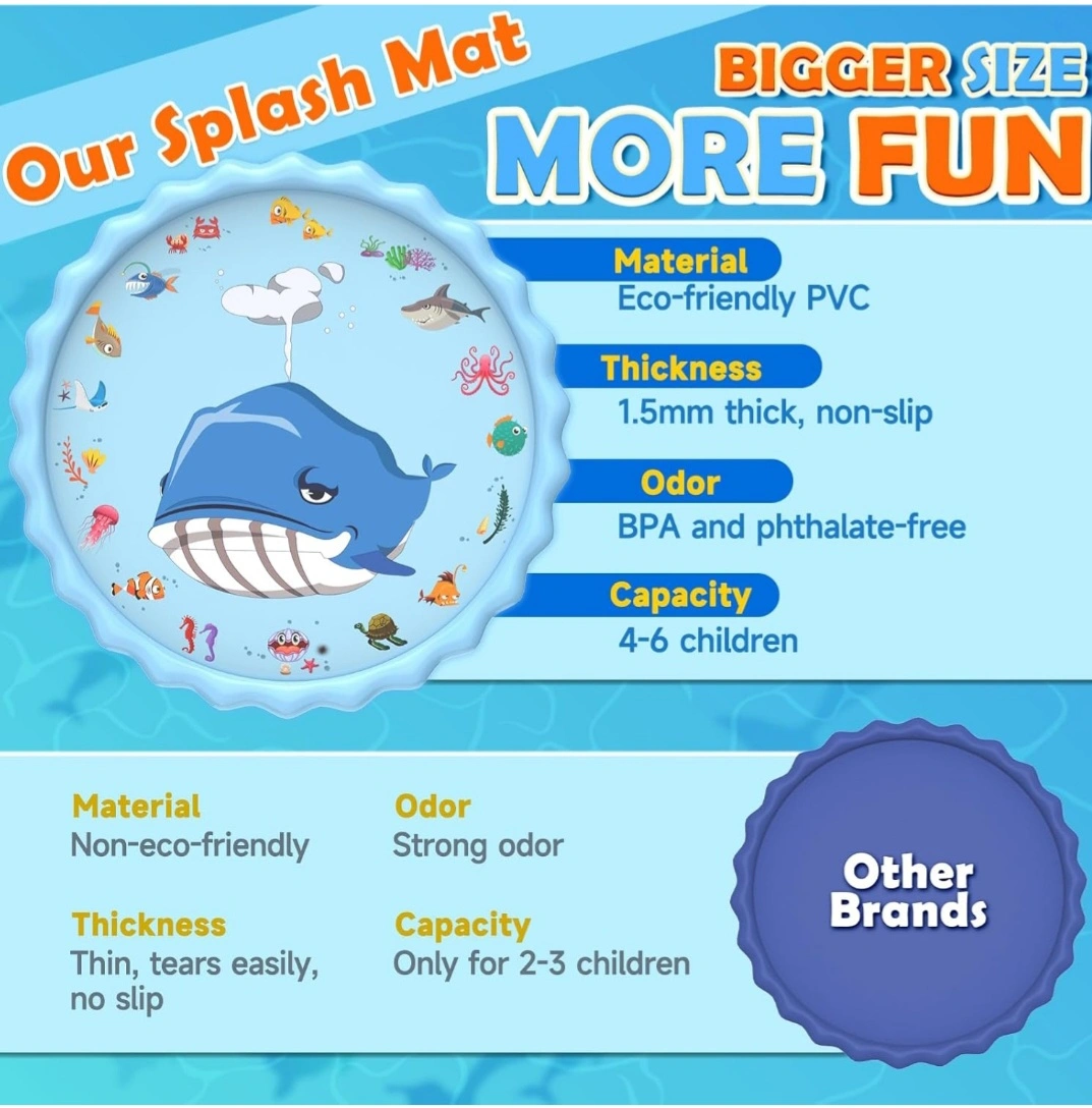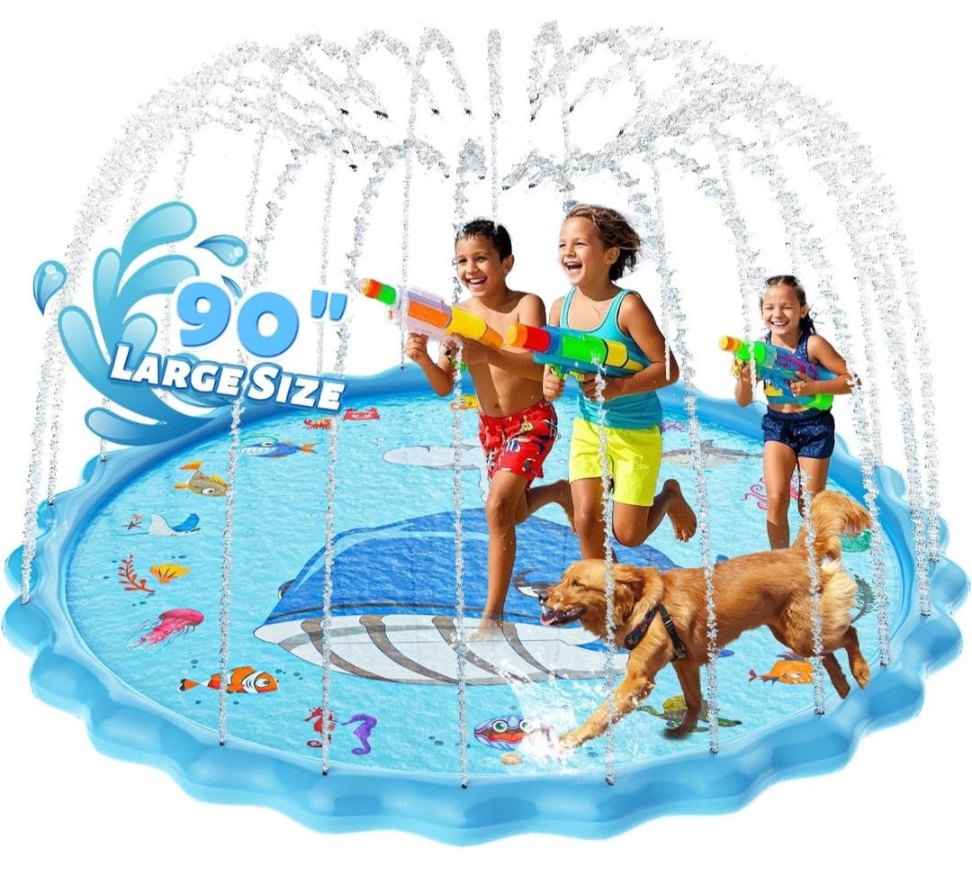 Get ready for some fun with this High Quality, 90-inch splash pad! It's easy to install, just connect it to your garden hose. The height is adjustable, so you can control the water volume. Perfect for kids and parents to splash around and have fun.