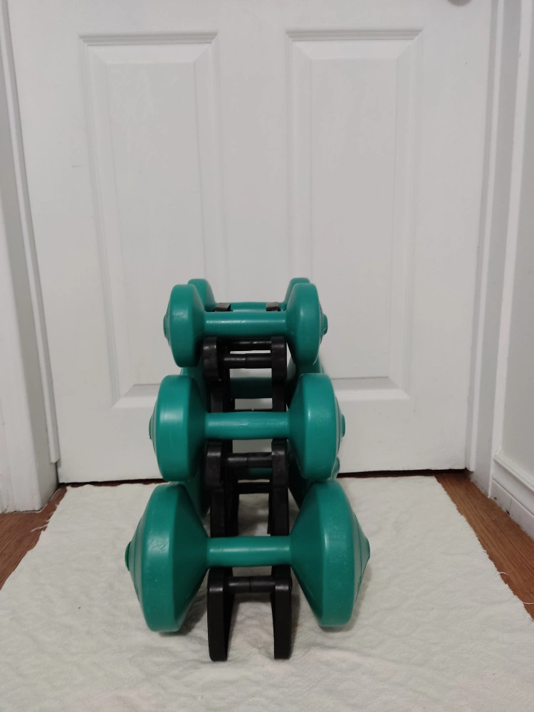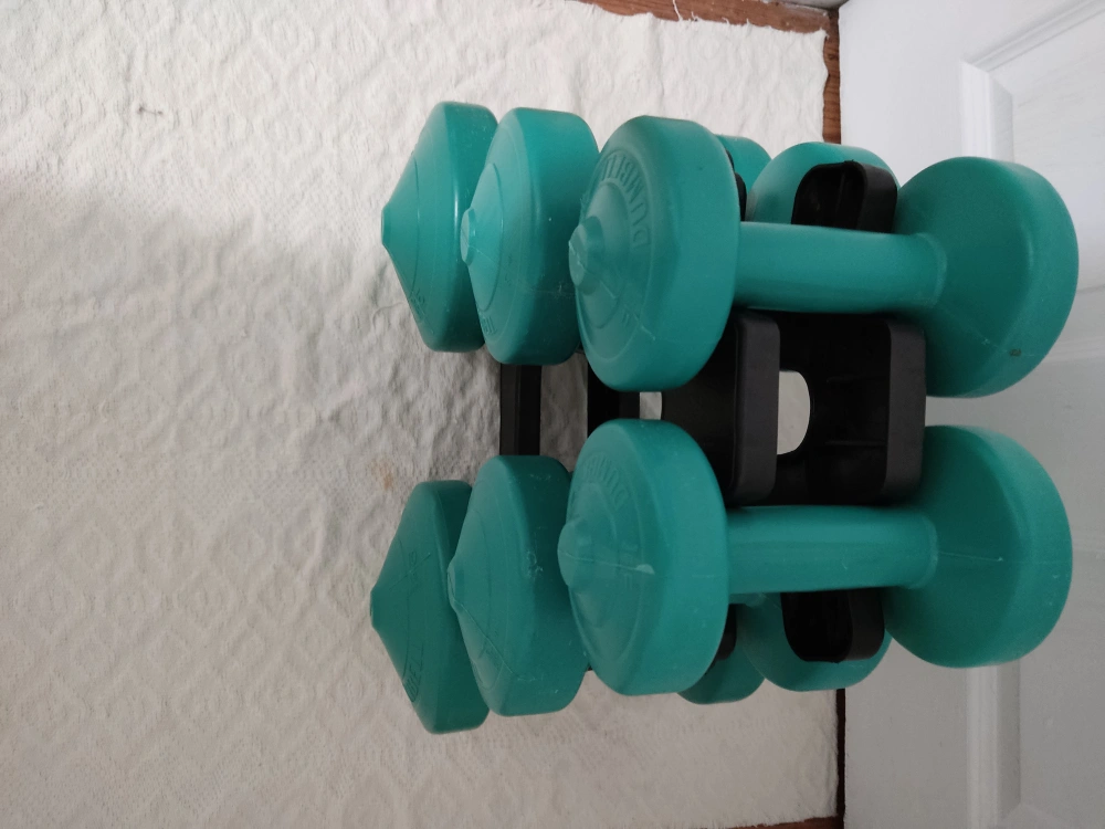 96Dumbbell Set with Rack - Green. Selling a set of dumbbells with a convenient rack. They're in good condition and ready for your home workouts! The dumbbells made of plastic. Weights varies from 10 lbs to 2.5 lb.