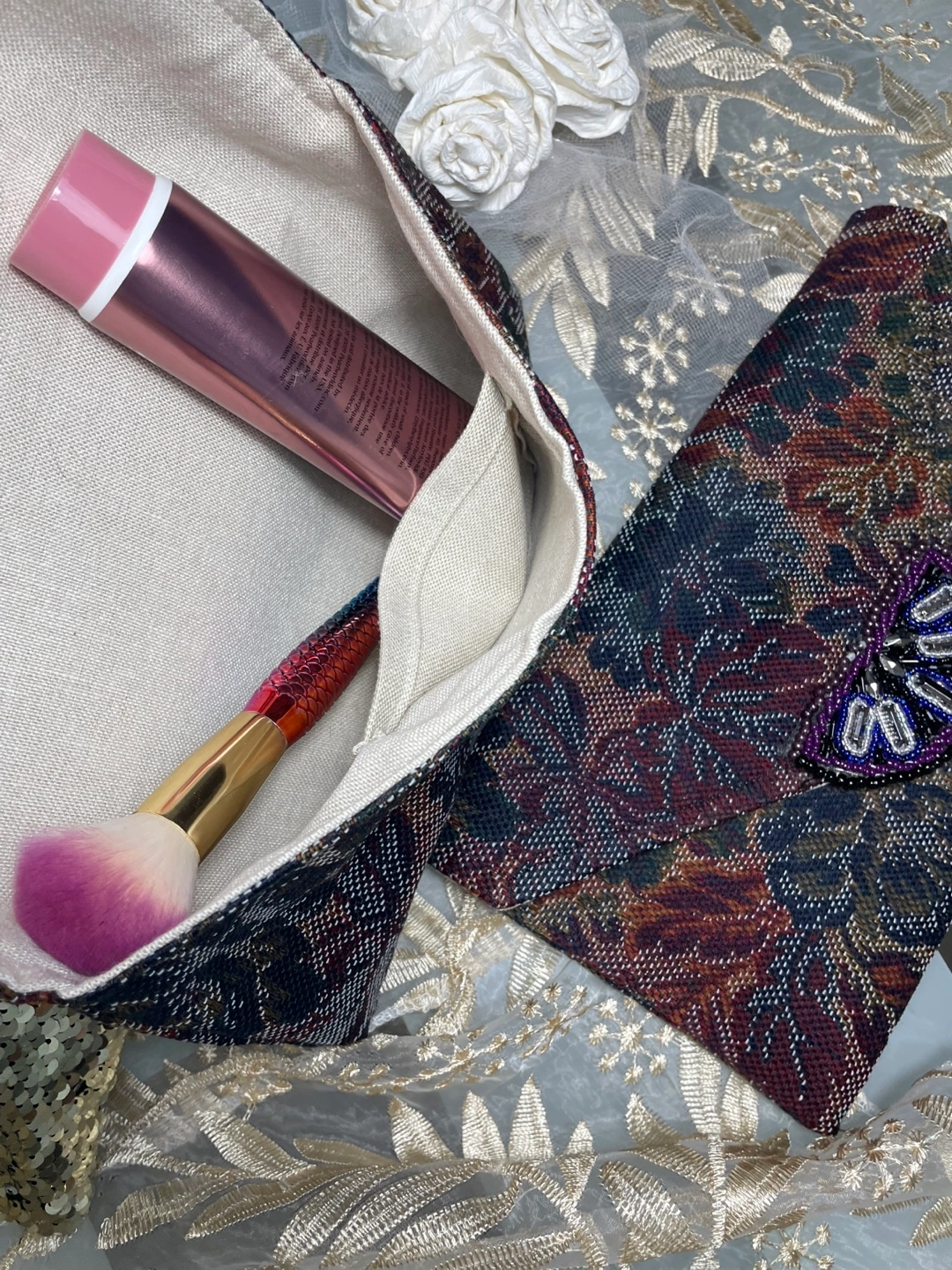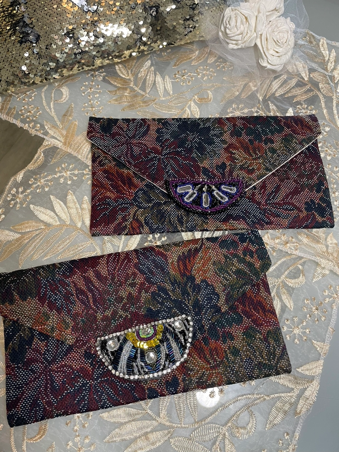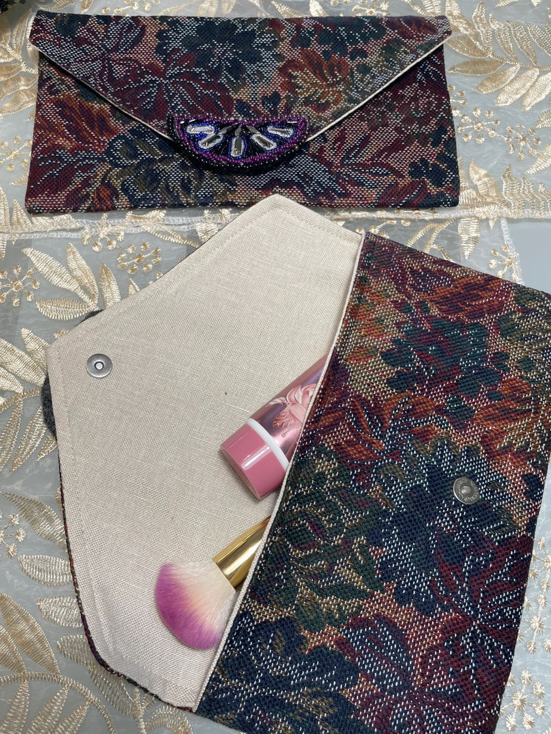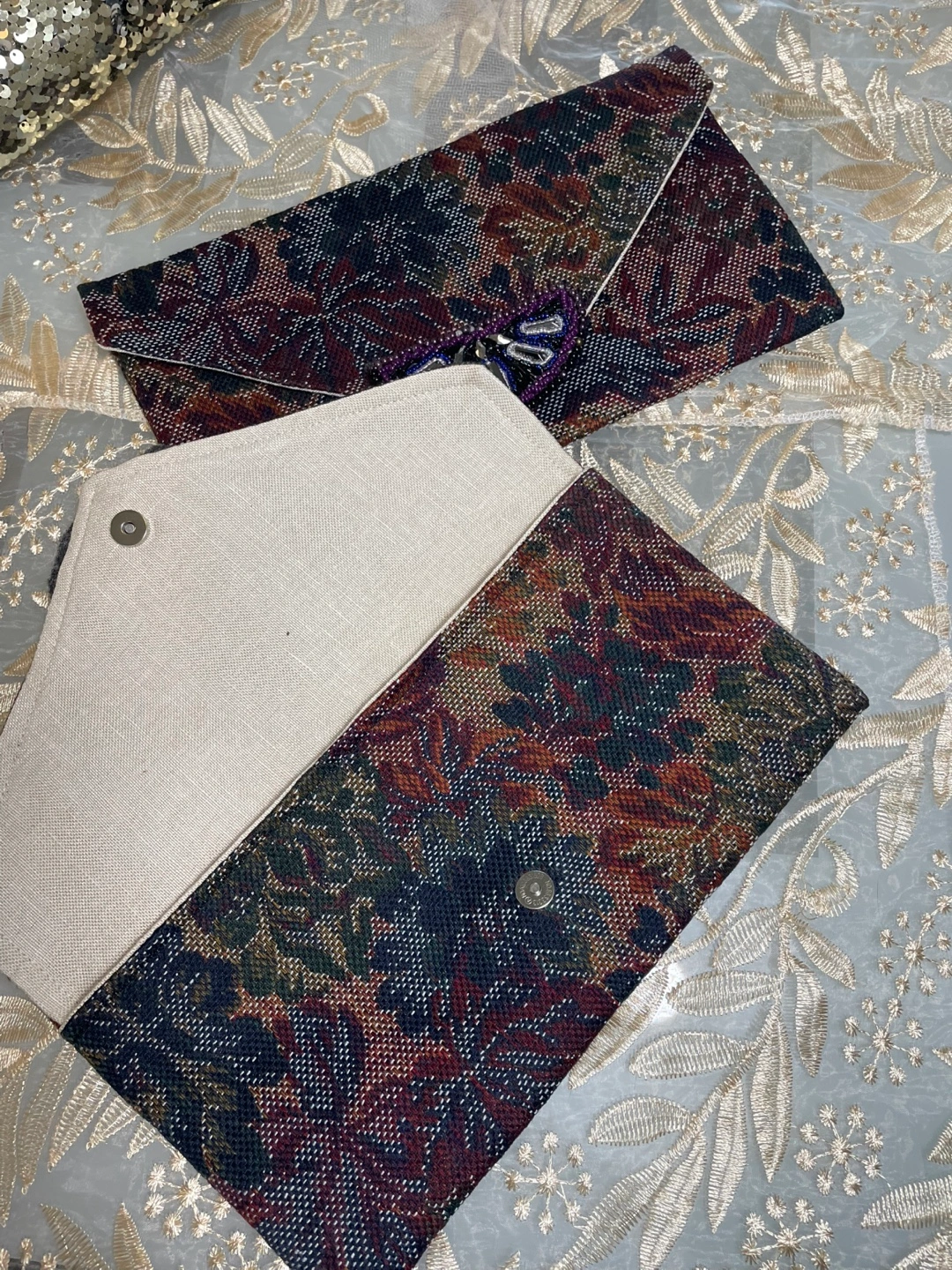 Selling a couple of unique clutch purses with a beautiful floral tapestry design! These are perfect for adding a touch of elegance to any outfit. They feature a snap closure and are lined with a neutral fabric. Great for evenings out or special occasions!