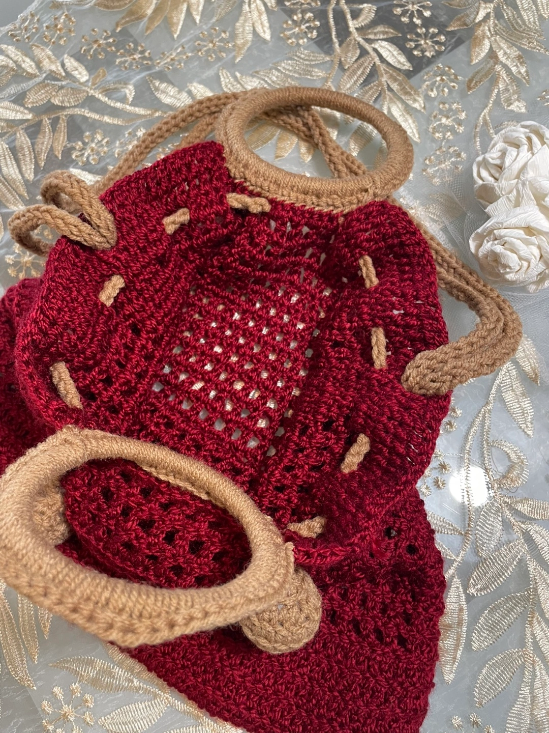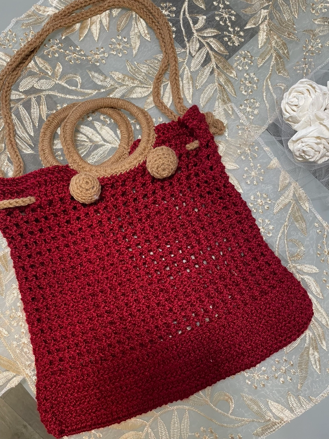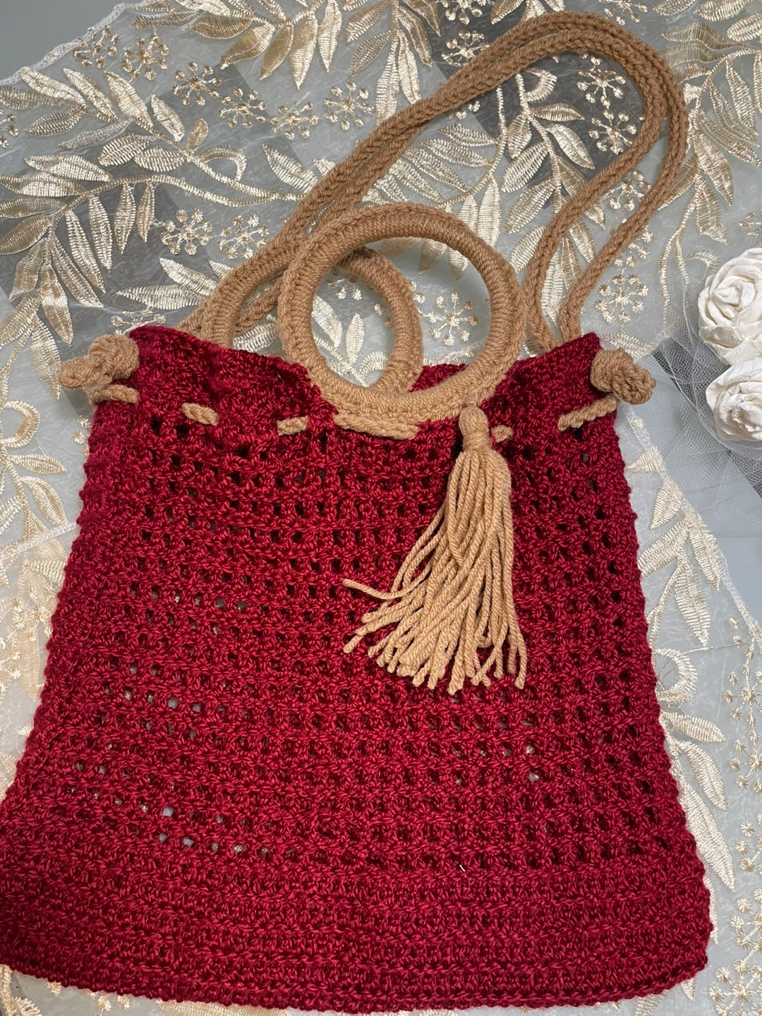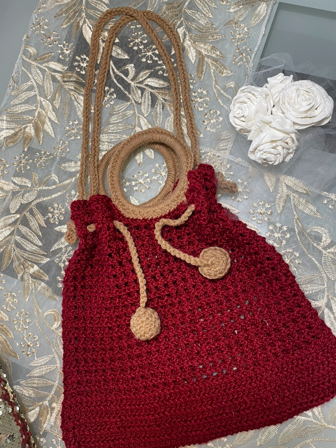 Selling a unique, handmade crochet bucket bag! It's a beautiful deep red colour with tan accents, perfect for adding a touch of handcrafted charm to your outfit. The bag features a drawstring closure and sturdy handles, making it both stylish and practical for everyday use