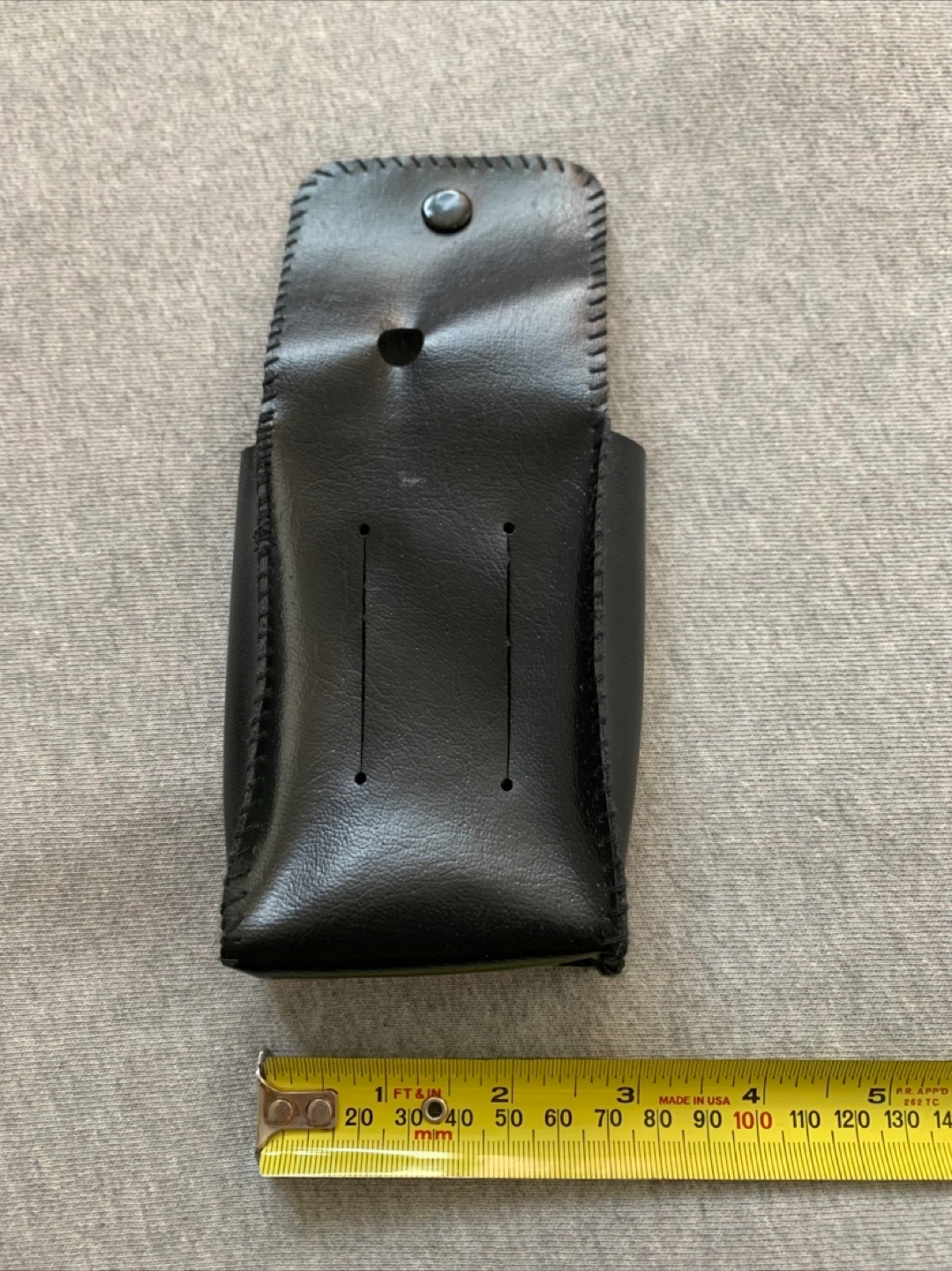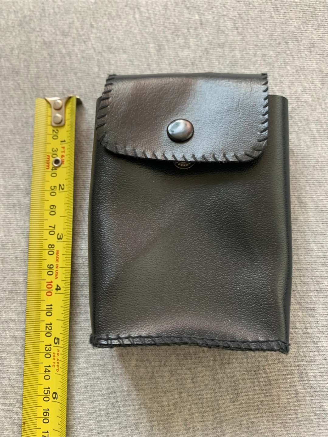 Soft sided, black with nice stitching. Button closure to hold a variety of item possibilities.