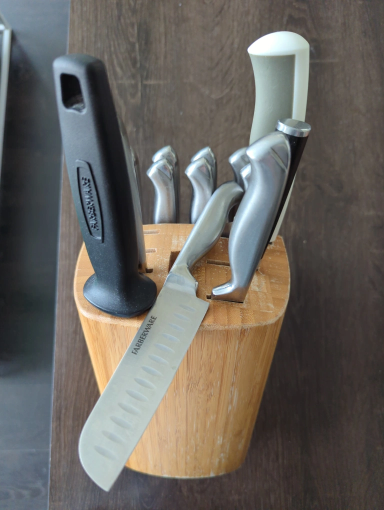 Selling a Farberware knife set complete with a wooden block. The knives have black, grey and silver handles.
