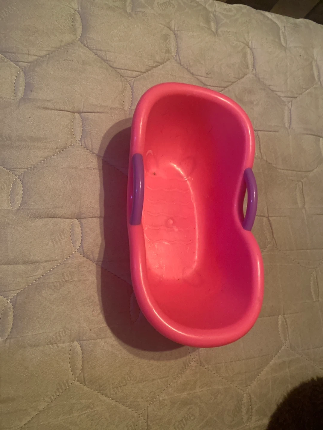 Selling a cute pink baby bathtub! It's in good condition and perfect for little ones. The tub has purple handles on each side for easy carrying and stability. Great for bath time fun!