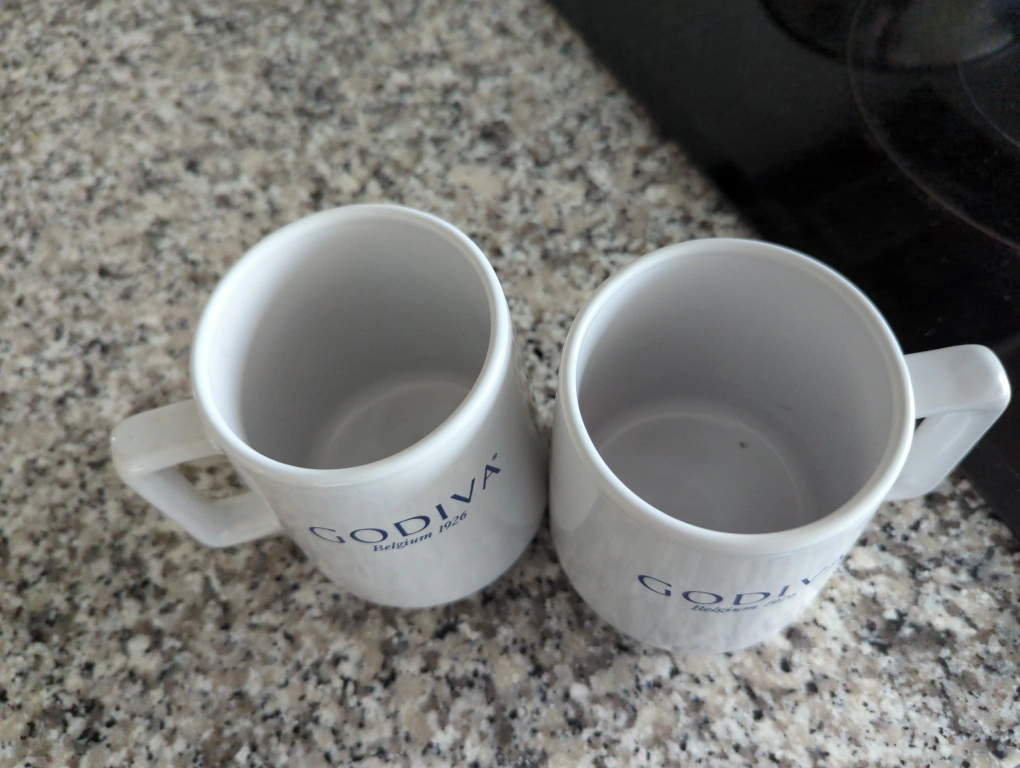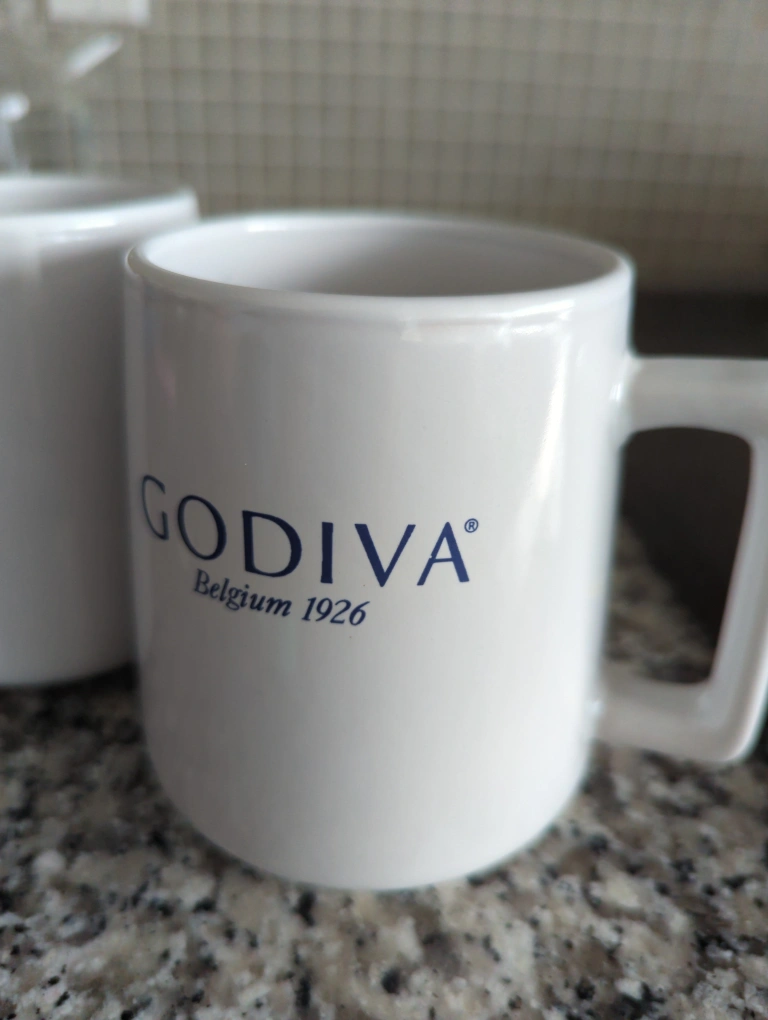 Here are two Godiva Belgium 1926 coffee mugs! They're perfect for enjoying your favourite hot beverage, especially if it's some delicious Godiva hot chocolate! They are white with the Godiva logo in blue